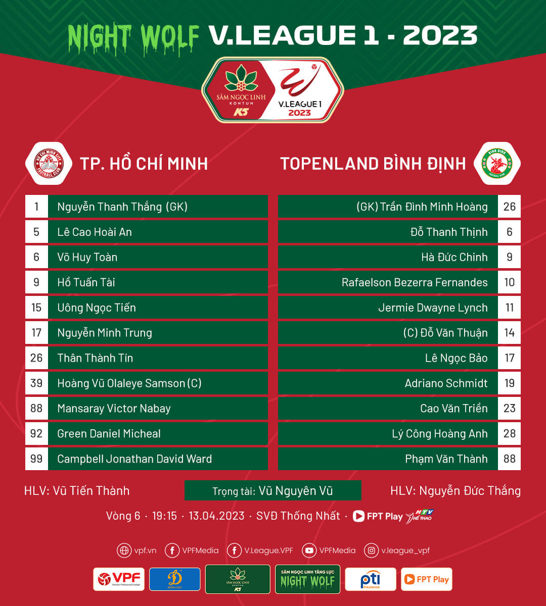 TP.HCM: Nguyễn Thanh Thắng, Lê Cao Hoài Anh, Thân Thành Tín, Campbell Jonathan David, Uông Ngọc Tiến, Võ Huy Toàn, Nguyễn Minh Trung, Hồ Tấn Tài, Hoàng Vũ Samson, Victor Mansaray, Green Daniel Micheal