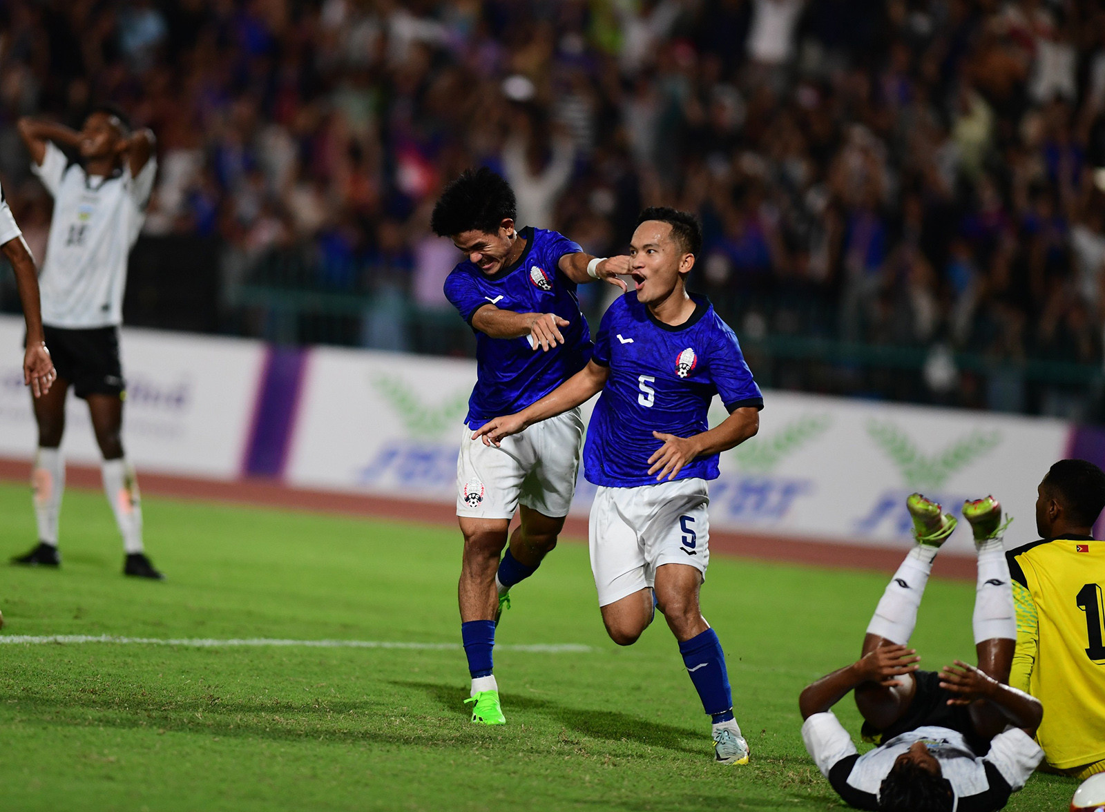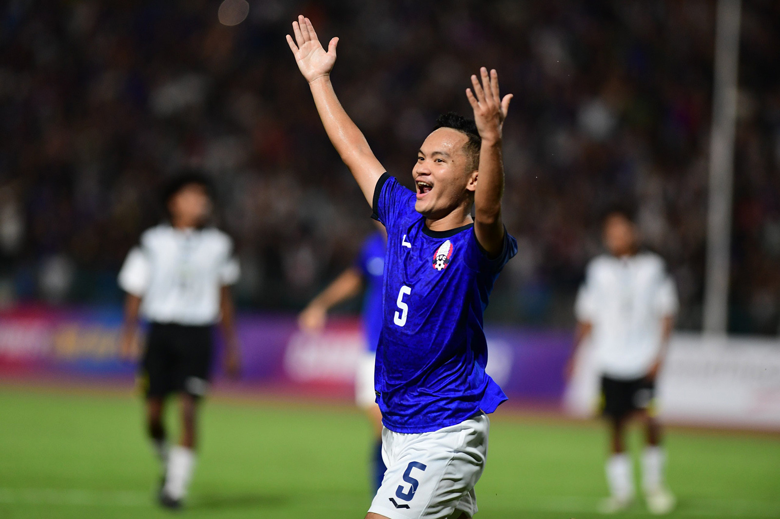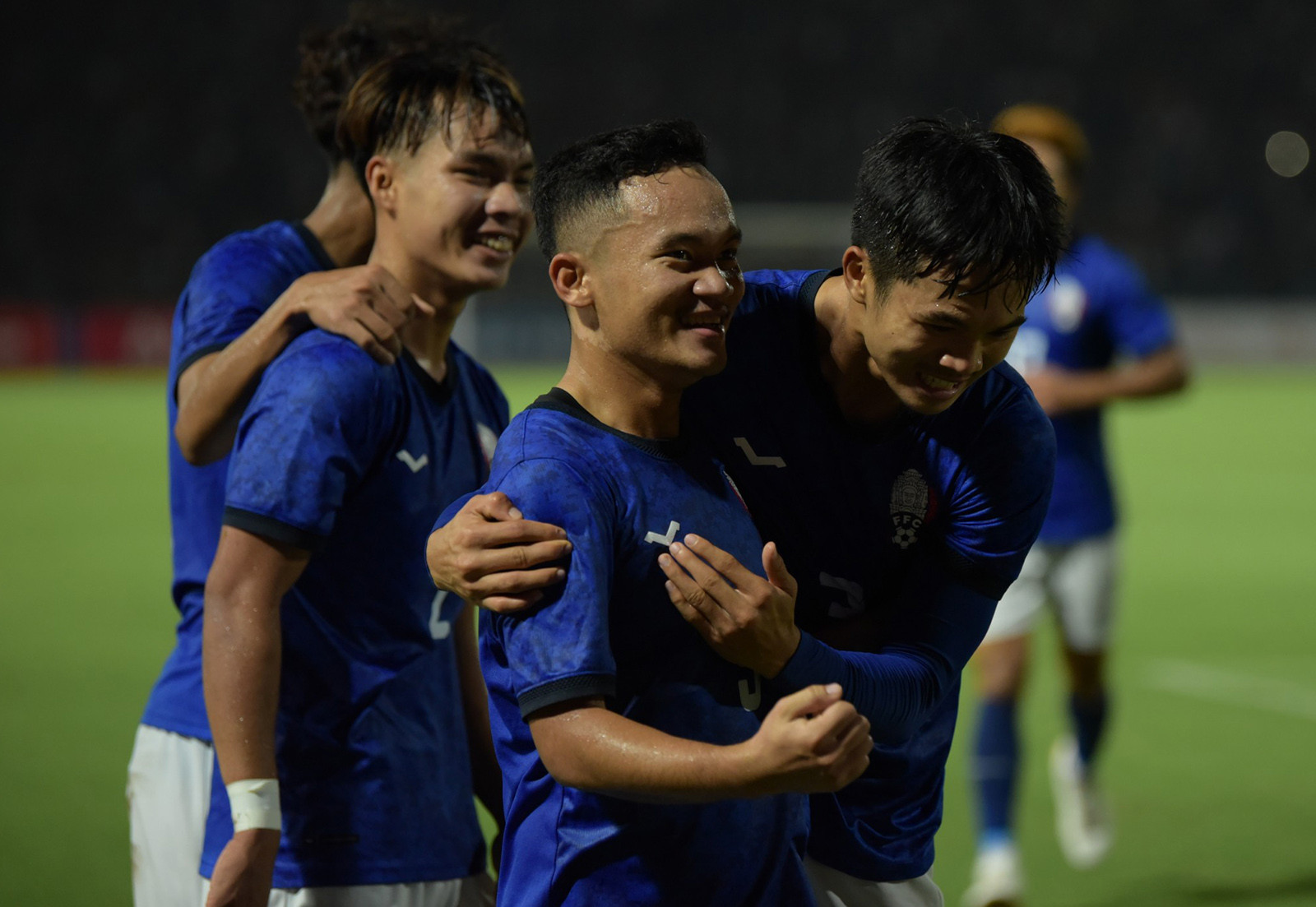 Màn bùng nổ vào cuối hiệp, với cú đúp của tiền vệ Chou Sinti, giúp chủ nhà U22 Campuchia dẫn trước 2-0.