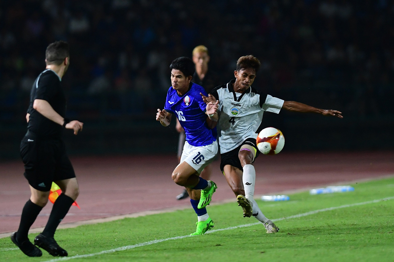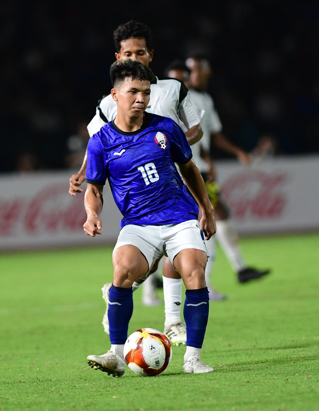 Chanthea có màn đột phá trung lộ rất kỹ thuật, nhưng đồng đội Lim Pisoth thực hiện cú sút chân phải đi trúng cầu thủ Timor Leste.