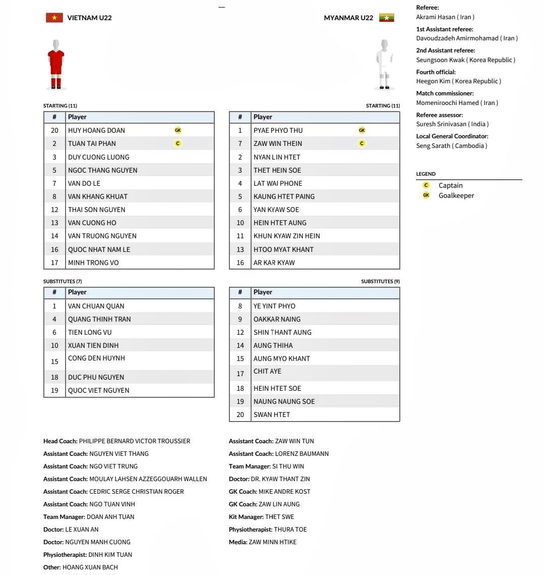 Trọng tài chính người Iran, ông Akrami Hasan thổi còi cho trận đấu được bắt đầu. U22 Việt Nam ra sân mặc trang phục màu đỏ, trong khi U22 Myanmar mặc quần áo màu trắng.