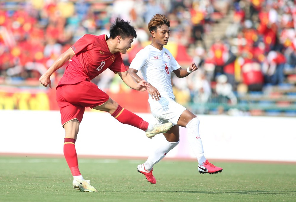 U22 Myanmar đang chơi hoàn toàn lép vế trước đội bóng áo đỏ, số ít tình huống lên bóng của họ dễ dàng bị U22 Việt Nam bẻ gãy.