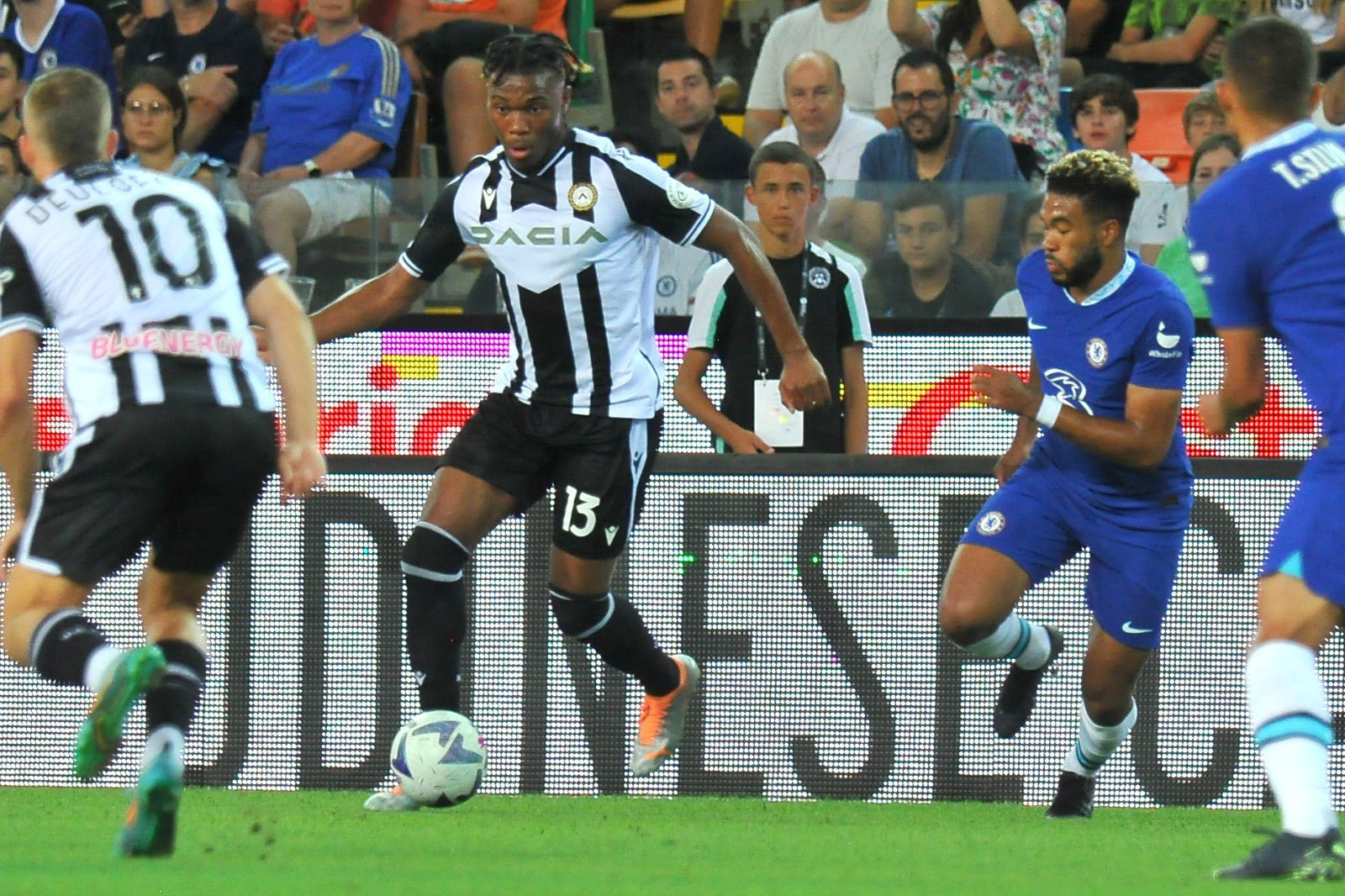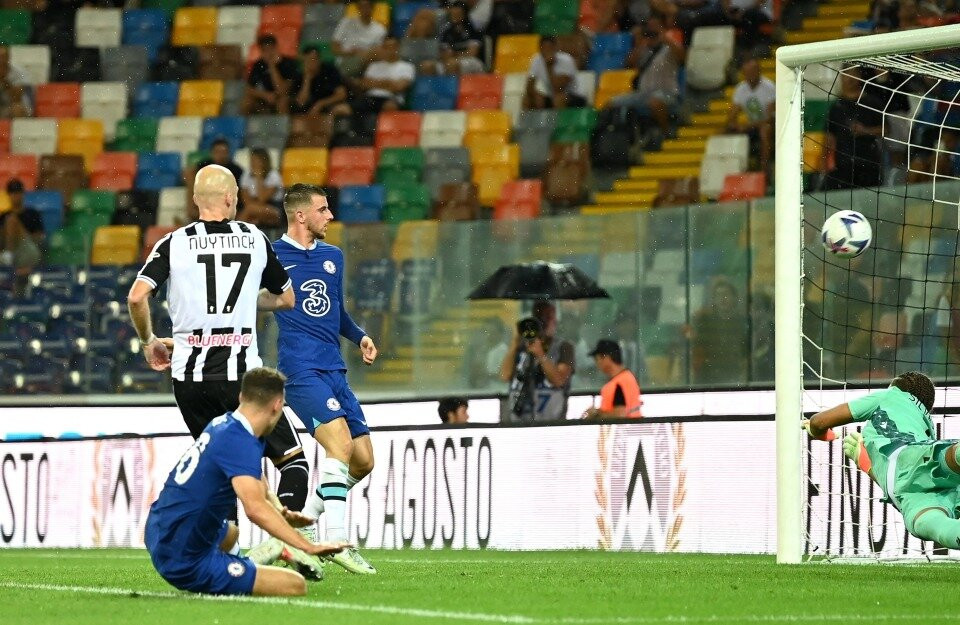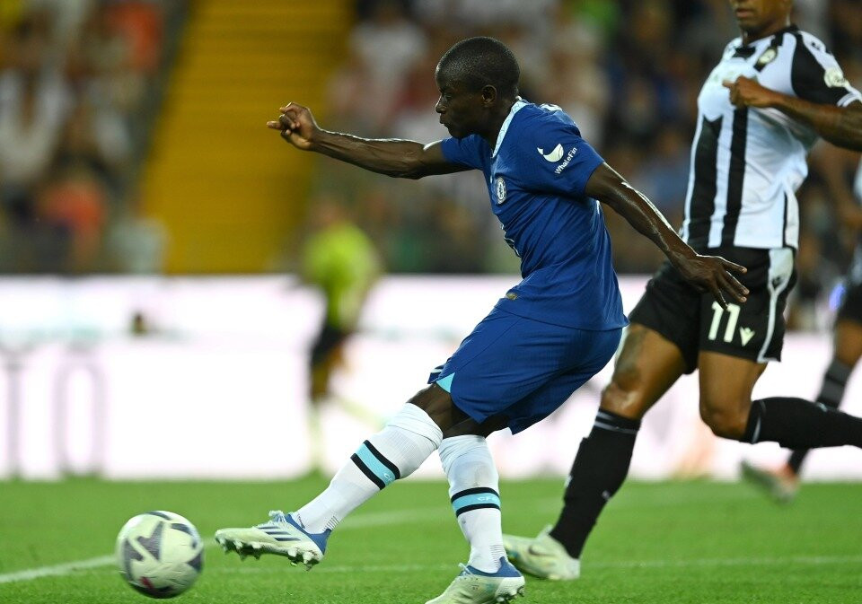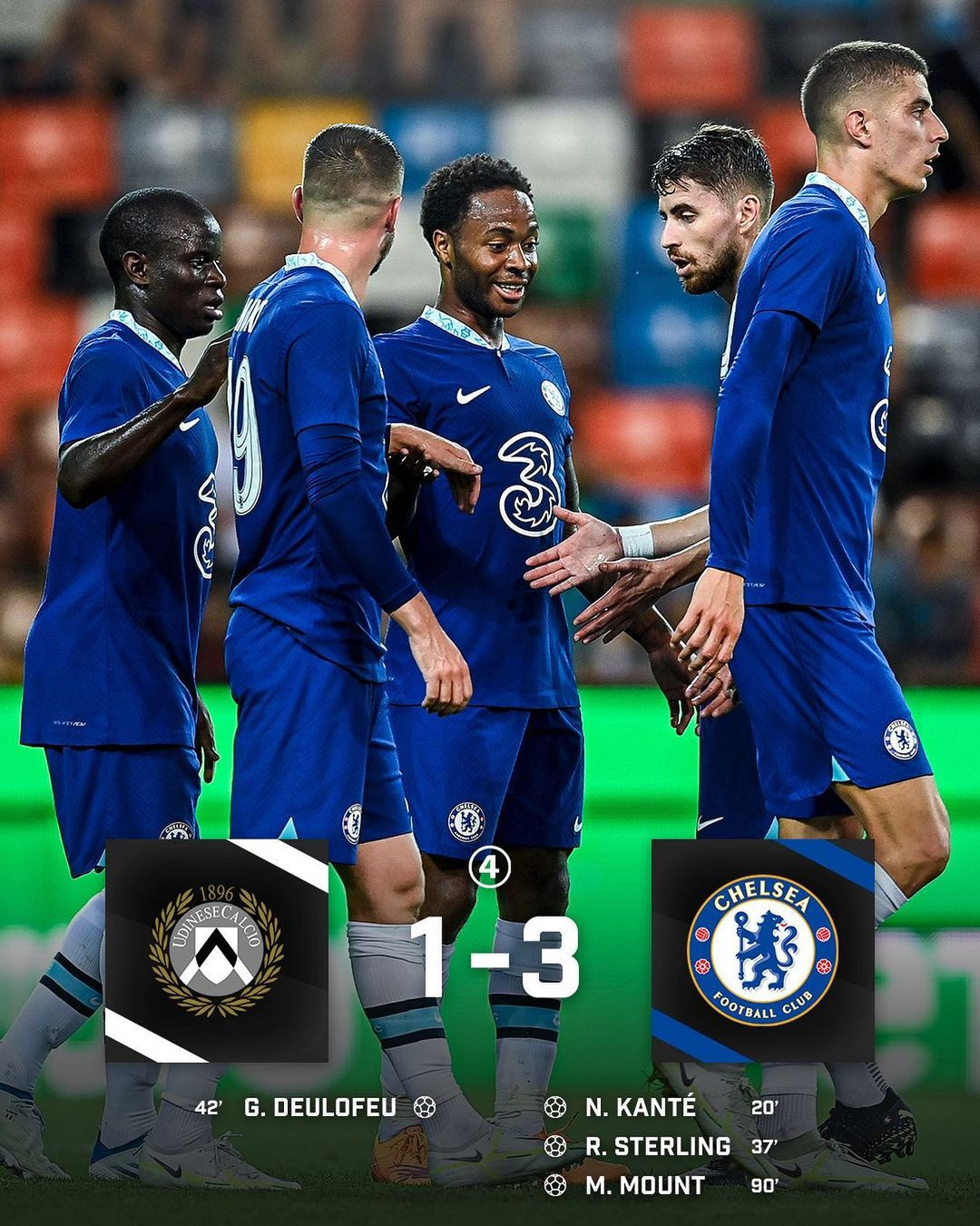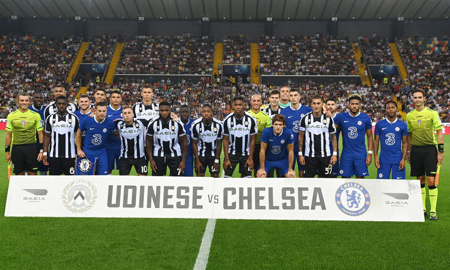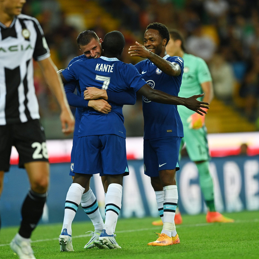 Hai đội đá giao hữu trước thềm mùa giải mớiHLV Tuchel tung ra sân đội hình mạnh nhất ở thời điểm hiện tạiChelsea áp đảo và có được bàn mở tỷ số với cú sút xa của KanteĐồng đội chúc mừng tiền vệ người PhápSterling cũng có pha lập công đầu tiên trong màu áo mới, sau đường kiến tạo của JorginhoTân binh trị giá 50 triệu bảng dần cho thấy sự hòa nhập ở ChelseaUdinese gỡ lại một bàn nhờ công DeulofeuMason Mount ấn định tỷ số 3-1 lúc cuối trậnĐội khách giành chiến thắng thuyết phục