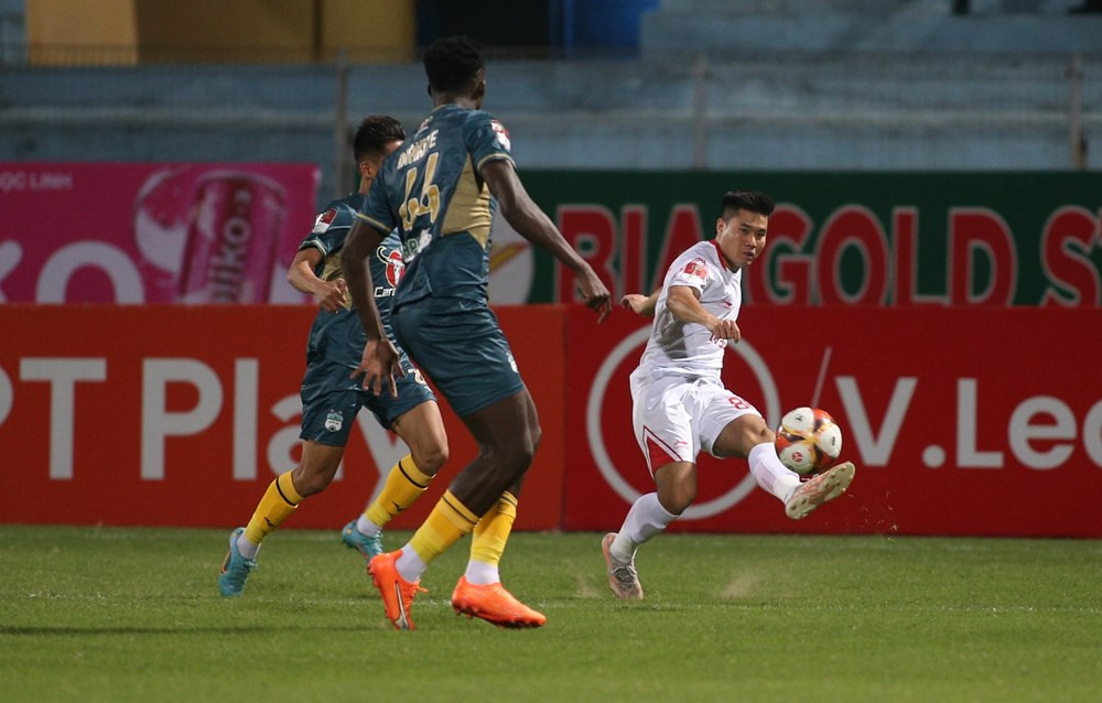 Hoàng Đức có pha độc diễn rồi tung cú sút trong vòng vây của 3 cầu thủ HAGL, tuy nhiên bóng đi tìm đúng vị trí mà thủ môn Văn Lợi đã chọn sẵn.