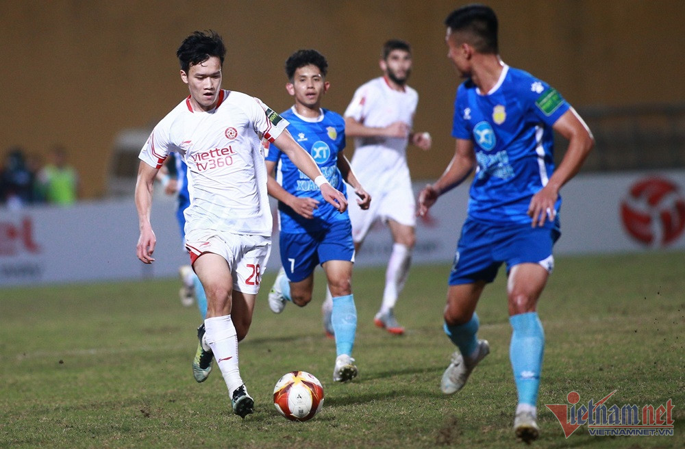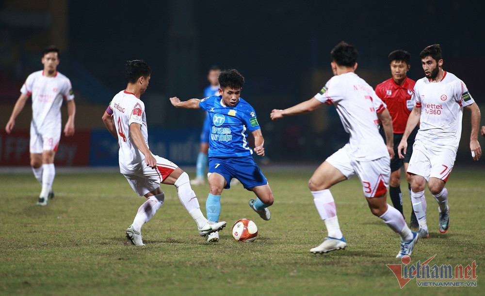 Nam Định có pha tấn công "xé toang" hàng phòng ngự của Viettel. May cho chủ nhà khi Hoàng Đức kịp thời lao về bọc lót.