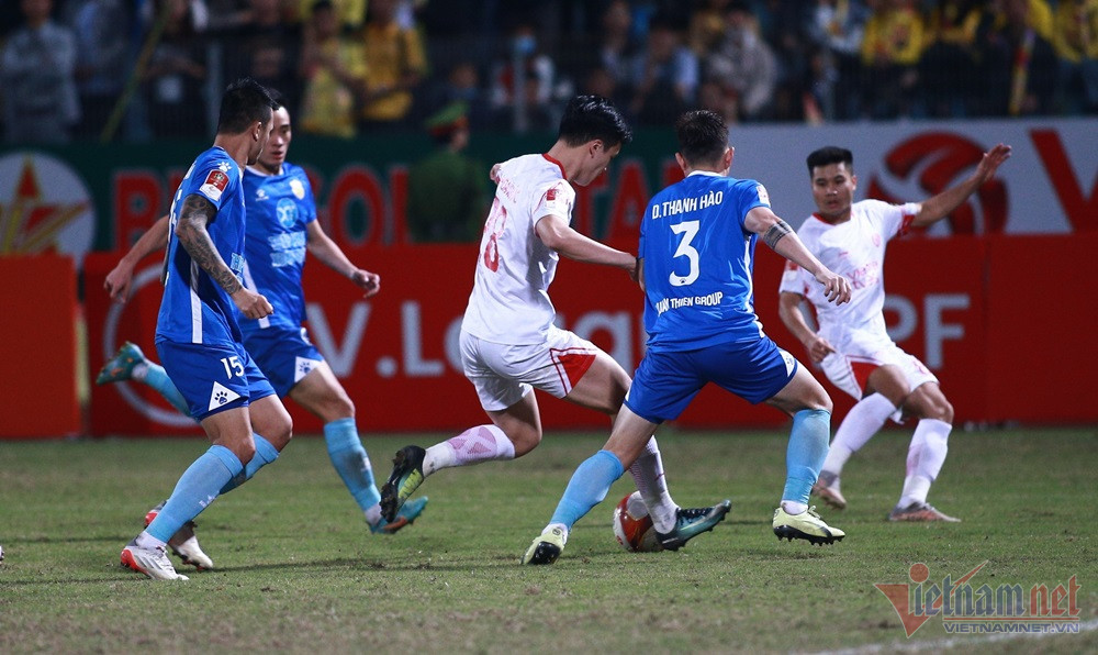 Hoàng Đức xoay sở trong vòng vây của 5 cầu thủ Nam Định trước khi dứt diểm đưa bóng vọt xà ngang đối phương.