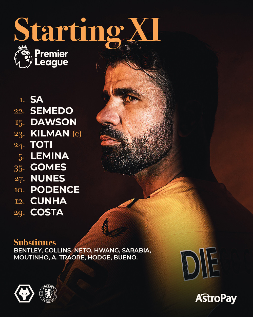 Wolves: Jose Sa, Semedo, Dawson, Kilman, Toti Gomes, Podence, Lemina, Joao Gomes, Nunes, Cunha, Diego Costa.