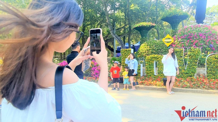 Một số hình ảnh du khách thích thú check-in tại đường hoa ở Lễ hội tình yêu hòn Trống Mái.