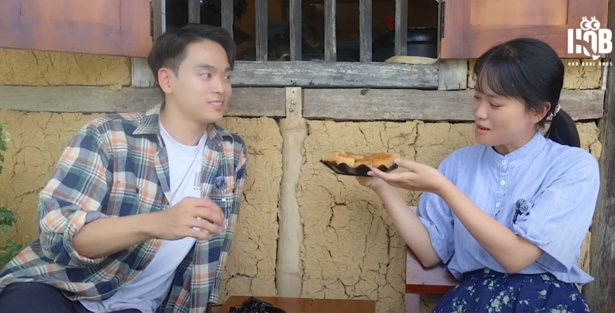 Ngoài ra, chàng YouTuber người Hàn còn thích thú khi lần đầu được nếm thử món bánh áp chao ở Cao Bằng. Món bánh này thoạt nhìn có vẻ ngoài giống bánh rán nhưng phần nhân được làm từ thịt vịt thái miếng. Nhờ đó bánh có hương vị đặc trưng riêng, khác hẳn so với các món bánh rán nhân mặn làm từ thịt lợn xay và mộc nhĩ, miến.