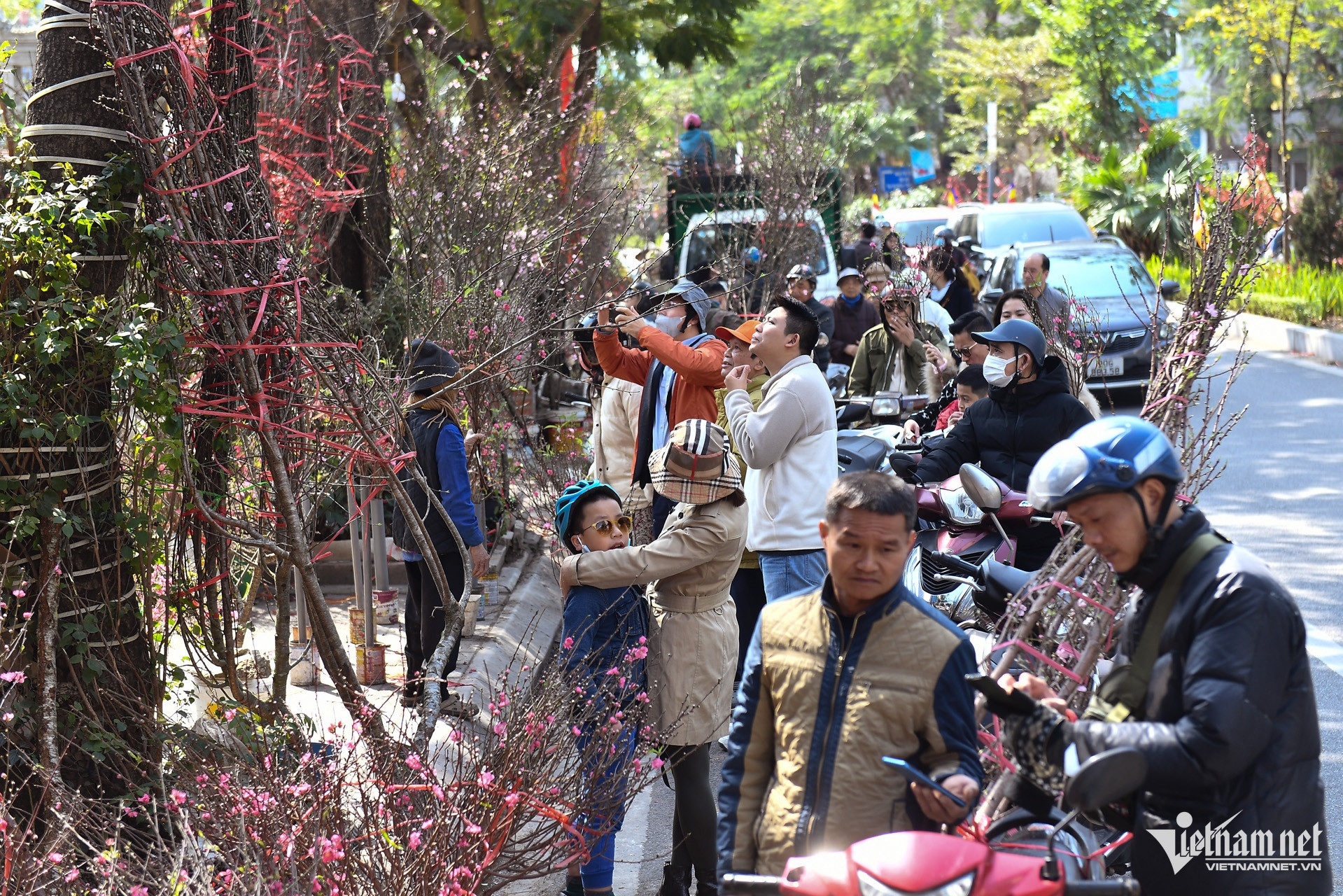 Ông Đại vừa chốt mua được một cành đào to giá 1 triệu đồng, buộc lên xe máy tự chở về. Ông cho biết, trước đó người bán nói giá 1,5 triệu đồng. "Vừa trả được 2 câu họ bán liền, không biết có hớ không nữa", ông nói.