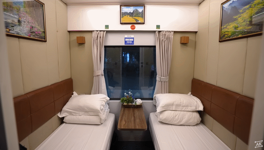 Cô đánh giá phòng có thiết kế khá phong cách, đẹp hơn những chuyến tàu trước đó họ từng đi. Trong phòng có đầy đủ tiện ích với ga, gối, đệm đã được làm sạch và gấp gọn, có bàn trà và góc đựng đồ dưới gầm giường lẫn trên cửa ra vào.