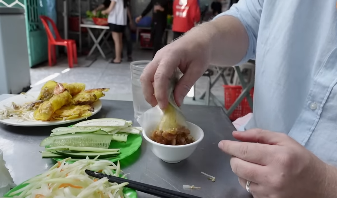 Anh còn tỏ ra sành ăn như người Việt khi cuộn một miếng bánh xèo với bánh tráng, thêm rau sống rồi quệt với nước chấm làm từ sốt đậu phộng. Phần sốt chấm này cũng là nét khác biệt của quán so với các nơi khác.