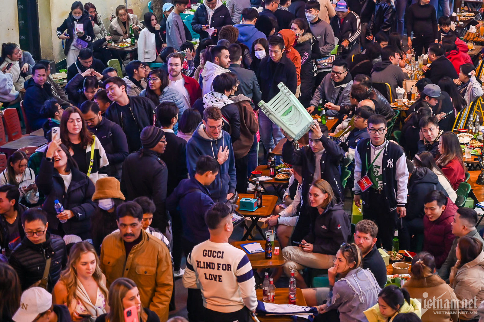 Ẩm thực Tạ Hiện được nhiều khách nước ngoài và người trẻ Việt Nam yêu thích vì sự sôi động, nhiều món ngon. Nhóm du khách ngồi trò chuyện bên bàn bia hơi và đĩa đồ nhắm, thưởng thức cái lạnh tê tái 13 độ C đêm Giáng sinh.