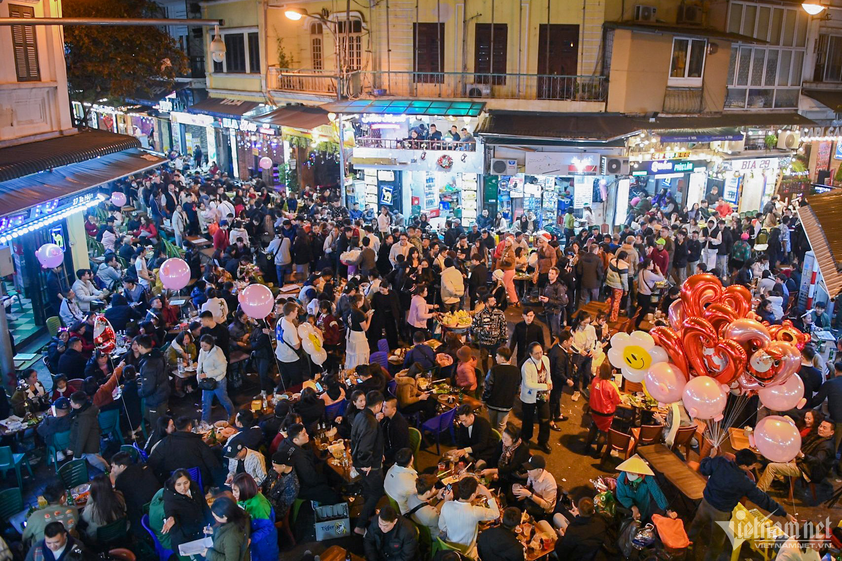 Trong không khí Giáng sinh sôi động của Hà Nội, nhiều du khách quốc tế đã tìm tới khu vực phố cổ để thưởng thức ẩm thực và cùng trò chuyện với bạn bè tối 24/12.
