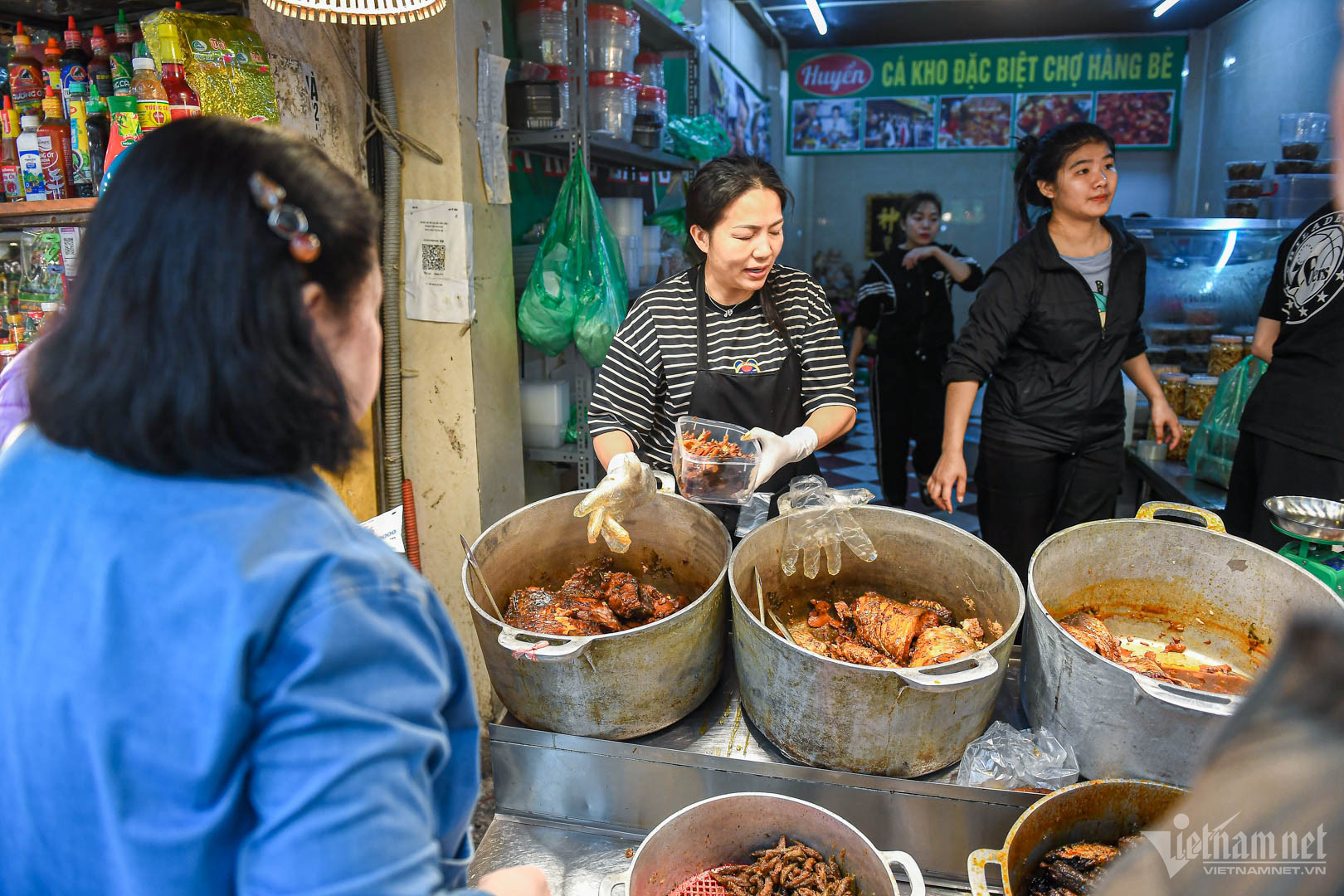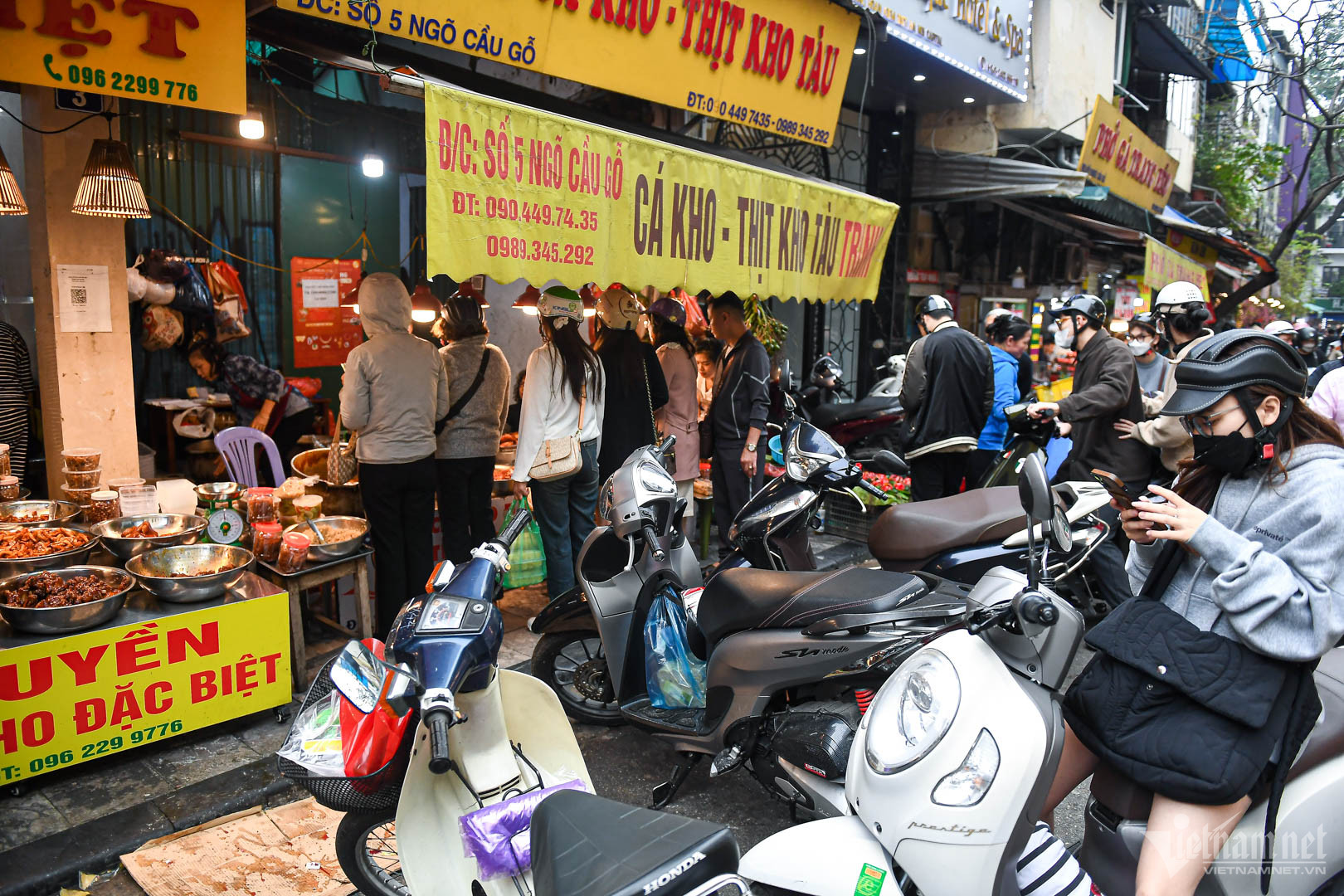 Hai quán cá kho nằm sát nhau ở ngõ Cầu Gỗ luôn trong tình trạng "quá tải" vào giờ cao điểm. Tại đây bán đủ các loại đồ ăn như cá trắm kho giềng, cá nục tròn kho thịt, tôm nõn rim, thịt kho dừa, thịt kho tàu, sườn rim...