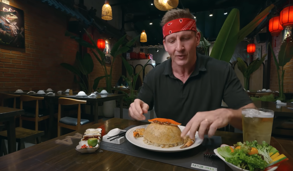 YouTuber người Mỹ tiếp tục thưởng thức và đưa ra nhận xét. Anh đánh giá món xôi cua rất ngon. Phần nhân dẻo thơm, ngoài vị ngọt của lạp xưởng còn dậy mùi vị đặc trưng từ thịt cua.