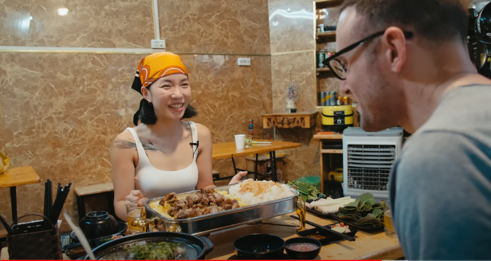 Tại đây, Fraser cùng cô bạn người Việt Nam là Lila tìm đến nhà hàng chuyên phục vụ đặc sản Tây Bắc ở phố Lê Văn Hưu, quận Hai Bà Trưng, Hà Nội để thưởng thức một số món ngon từ dúi.