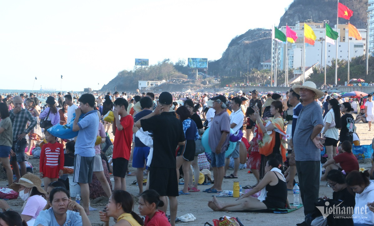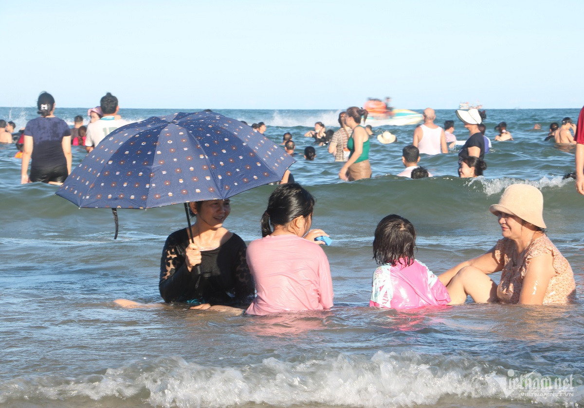 Ghi nhận của PV VietNamNet, trong tiết trời nắng nóng gay gắt trên nền nhiệt khoảng 35 độ C, nhiều người lựa chọn tắm biển từ sớm. Dọc bờ biển, rất đông du khách lựa chọn ngồi hóng mát, nghịch cát.