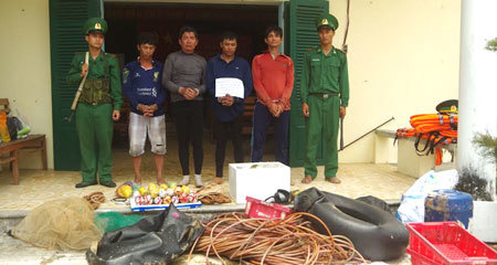 Các đối tượng bị bắt cùng với 30 quả mìn tự tạo đã tra kíp sẵn có trọng lượng 10kg dùng để đánh bắt hải sản.