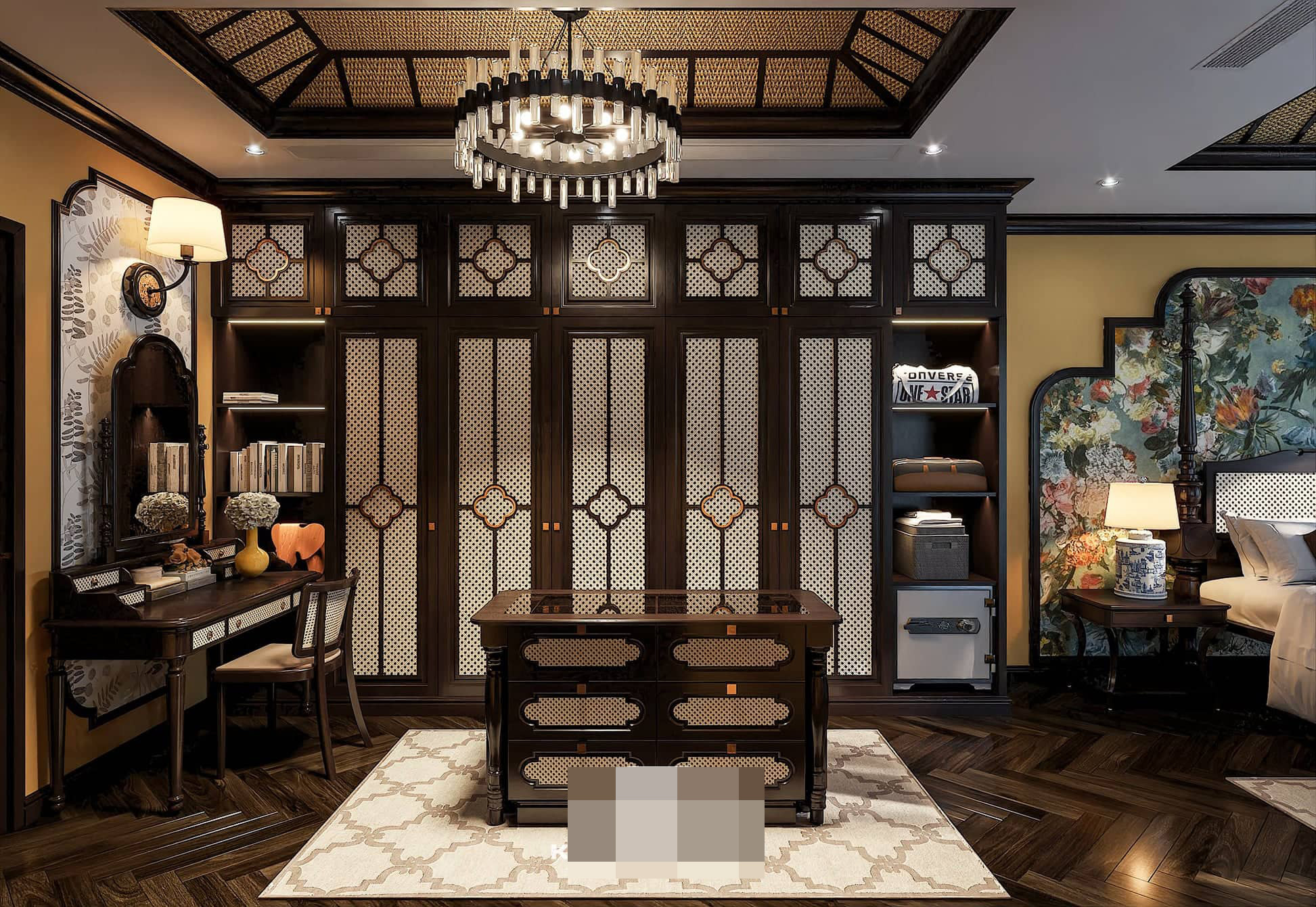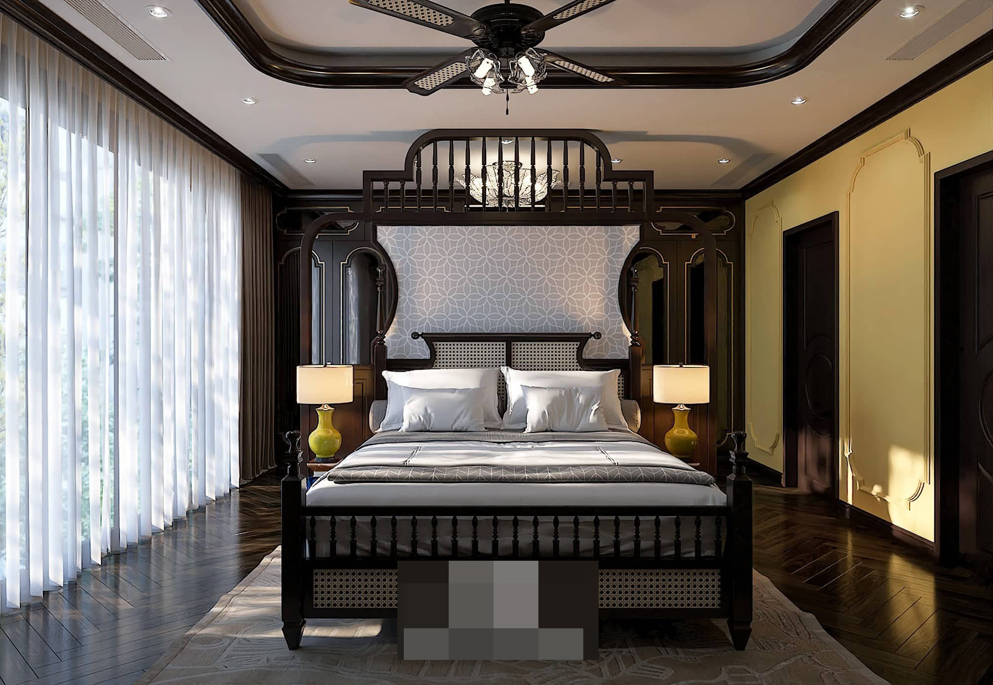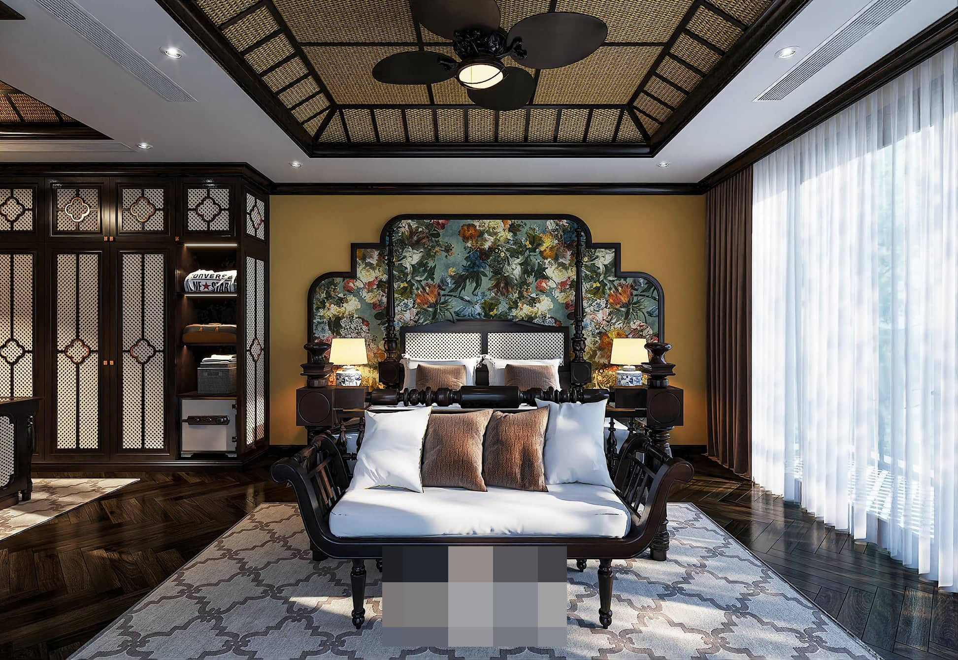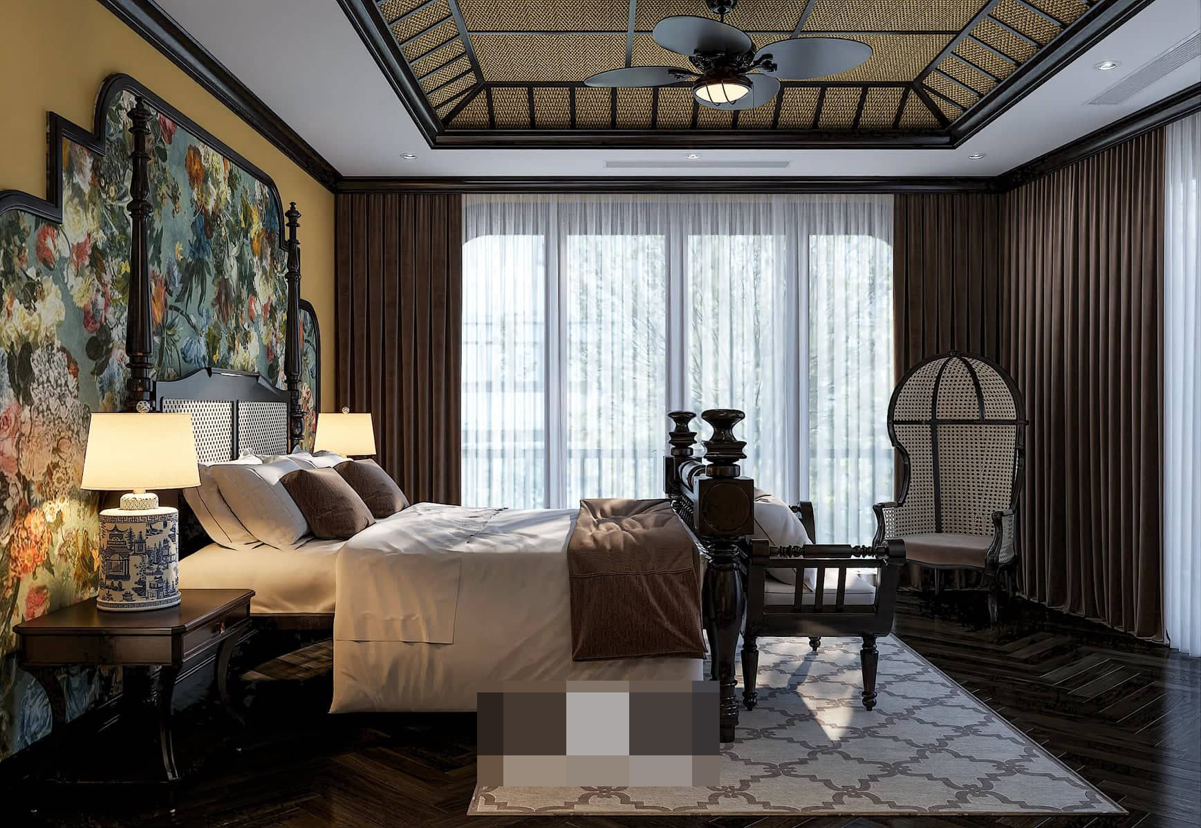 Thiết kế phòng ngủ theo phong cách Đông Dương sẽ làm cho căn phòng trở nên ấm áp, giảm tải bớt đi sự căng thẳng trong cuộc sống hàng ngày. Màu sắc đặc trưng của phong cách này sẽ giúp cho ta cảm thấy dễ chịu và thư giãn. Kiến trúc sư Quốc Được đã thổi vào đây một không gian nghỉ dưỡng lý tưởng, để mỗi giờ nghỉ ngơi của gia chủ sẽ thật nhẹ nhàng, êm ái, tái tạo năng lượng tích cực sau ngày dài bận rộn.
