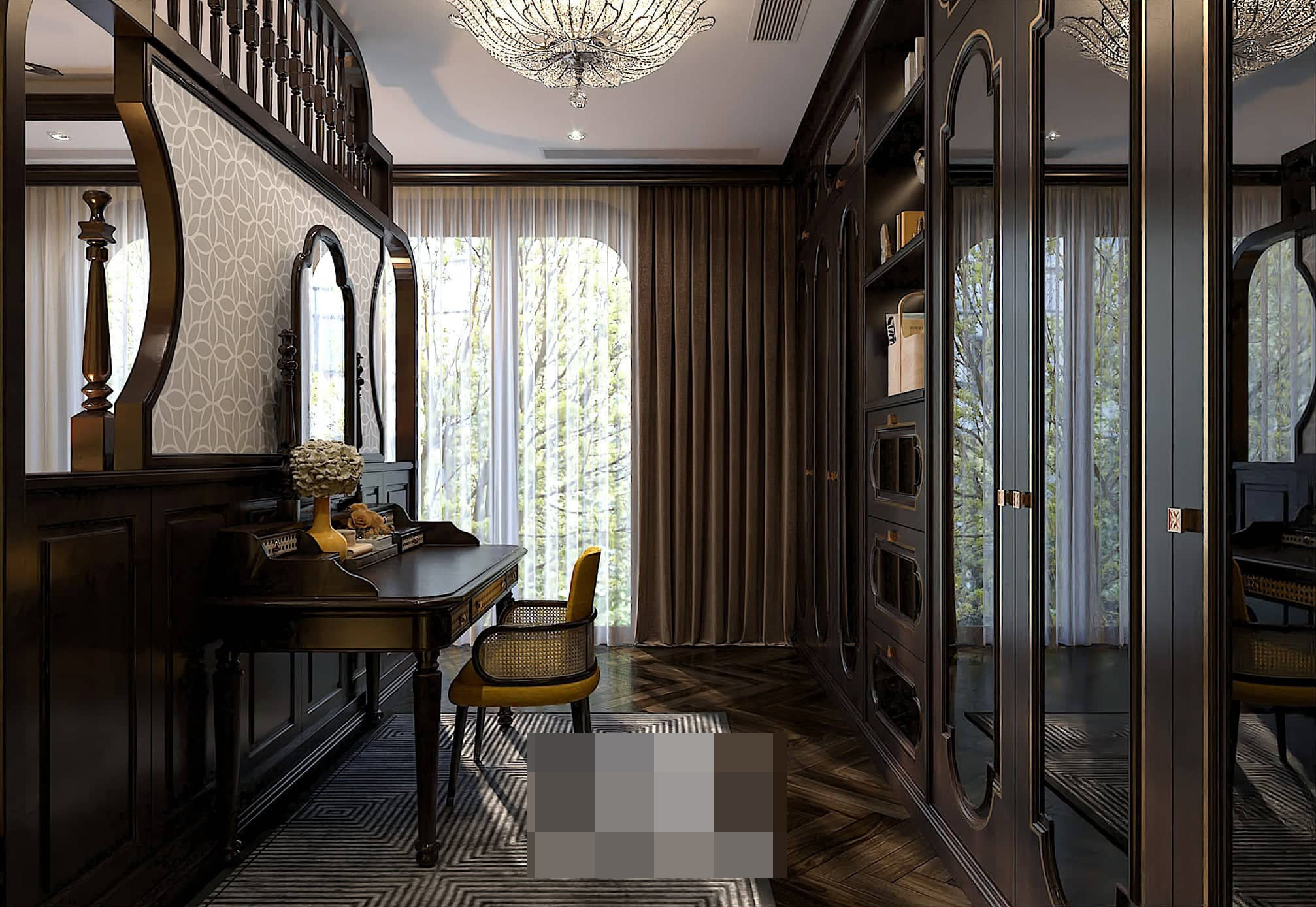Phòng thay đồ, tủ quần áo âm tường thiết kế tinh tế đến từng chi tiết nhỏ. Gam màu nâu trầm kết hợp với màu vàng nhạt đem lại cảm giác ấm áp cho căn phòng.