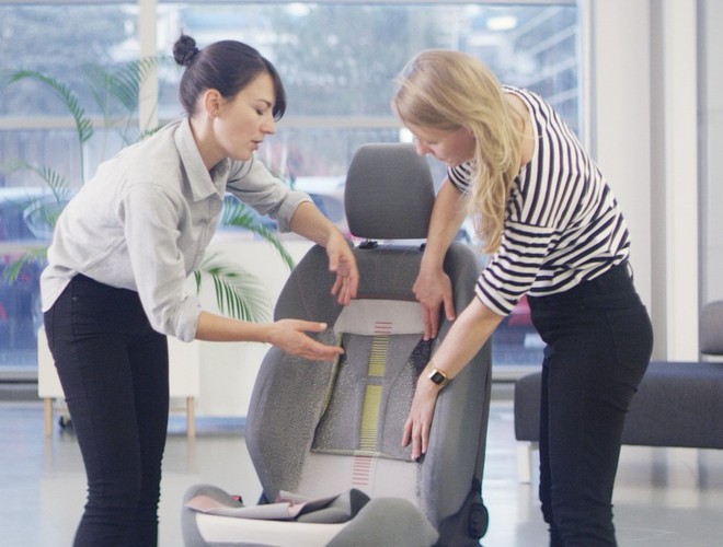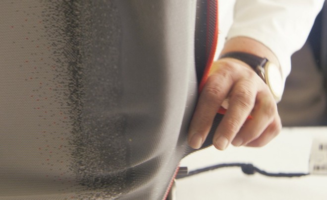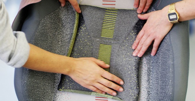 Kỹ thuật may 3D cho phép sử dụng chất liệu vải tích hợp sẵn chức năng kết nối cho ghế ngồi, có thể điều khiển cửa xe và cửa sổ, sẵn tính năng sưởi và cảm biến theo dõi tình trạng sức khỏe tài xế và sạc smartphone không dây. |