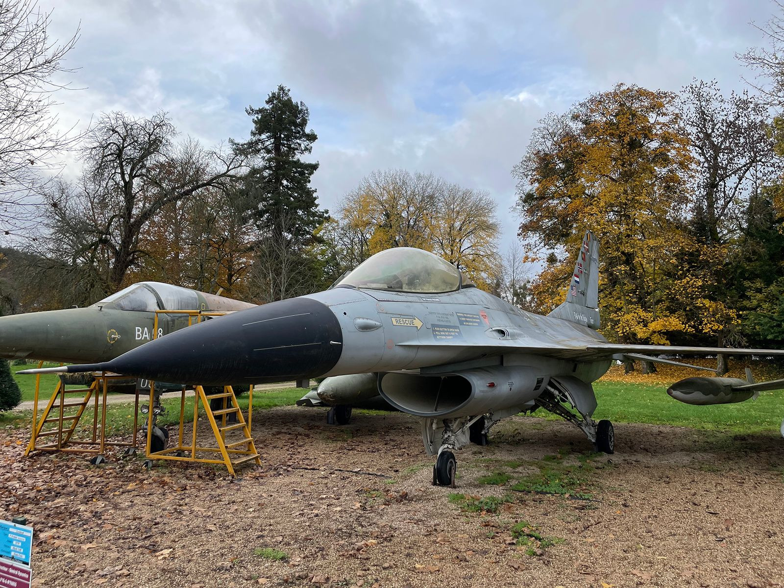 Những đường nét bóng bẩy, màu xám đen của chiếc máy bay phản lực F-16 Fighting Falcon, bên cạnh là hai chiếc máy bay kỳ cựu khác của bầu trời Chiến tranh Lạnh, một chiếc Dassault Mirage IV của Pháp và một chiếc F-104 Starfighter, không phải là điều bạn thường bắt gặp khi bước vào sân của một lâu đài Pháp 700 tuổi.