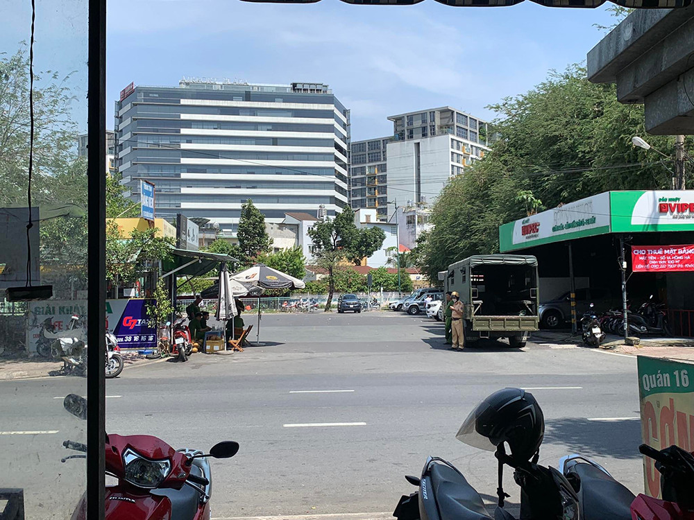 Khu vực trước chi nhánh Trung tâm đăng kiểm 50-05V bị phong toả. Những người bên trong không được ra ngoài.