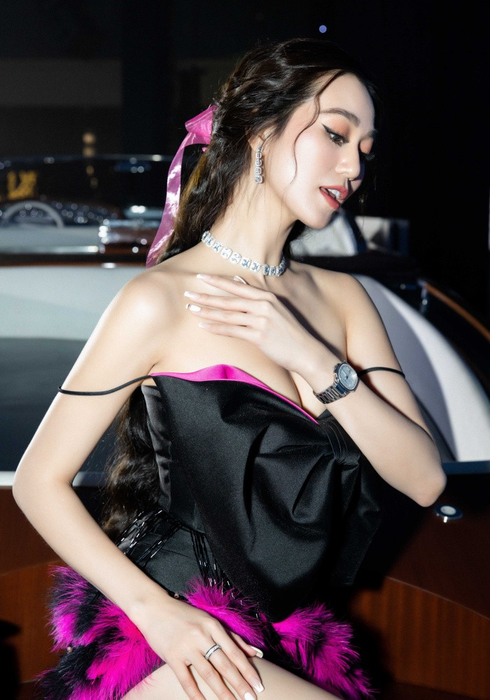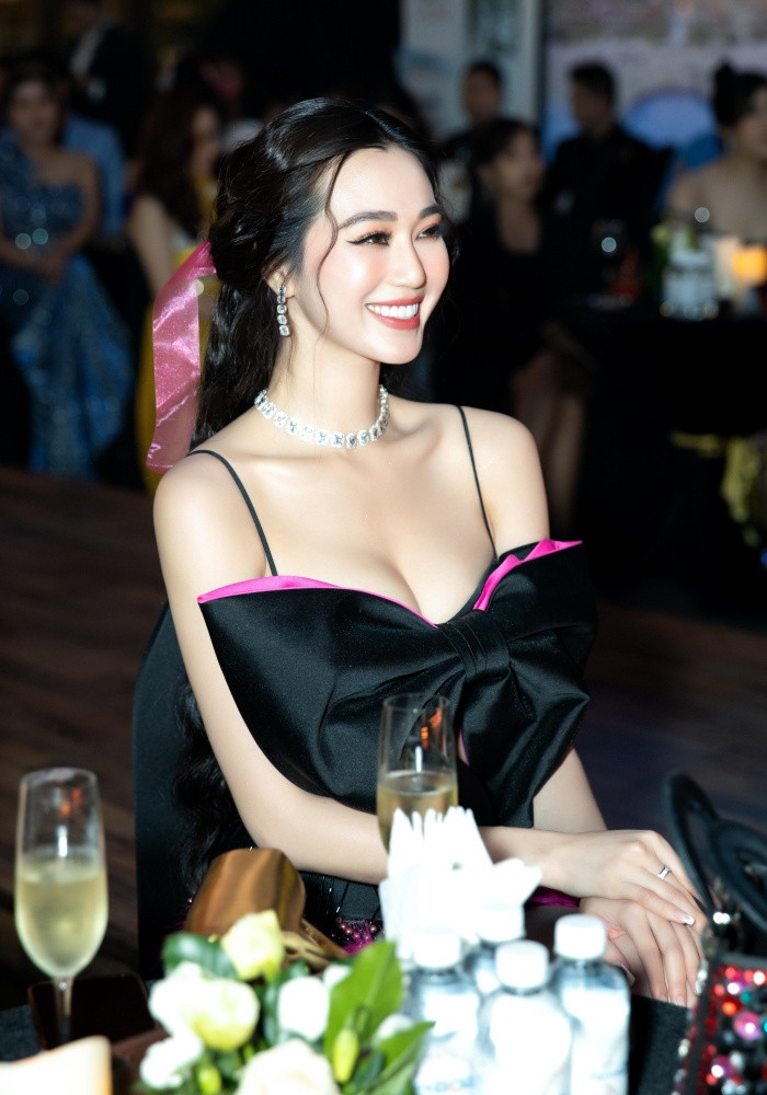 Là khách mời trong bữa tiệc dành riêng cho giới nghệ sĩ, Khánh My nổi bật với vẻ ngoài sexy cuốn hút. Nữ ca sĩ chọn đầm ngắn màu đen với điểm nhấn là chiếc nơ to khoe vòng một gợi cảm. Người đẹp cũng phối phụ kiện đính kèm để tôn vẻ ngoài sang trọng. Trong đó nổi bật là chiếc đồng hồ Patek Philippe Nautilus có giá gần 2 tỷ đồng và đôi giày đắt đỏ từ thương hiệu Jimmy Choo.