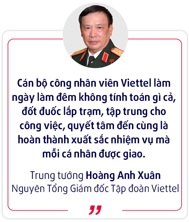 “Do tự làm nên mình làm chủ được và kích thích được lòng tự tôn dân tộc. Có đến hàng nghìn cải tiến trong quá trình thiết kế, thi công và khai thác mạng lưới. Cán bộ công nhân viên Viettel làm ngày làm đêm không tính toán gì cả, đốt đuốc lắp trạm, tập trung cho công việc, quyết tâm đến cùng là hoàn thành xuất sắc nhiệm vụ mà mỗi cá nhân được giao”, Trung tướng Hoàng Anh Xuân, Nguyên Tổng Giám đốc Tập đoàn Viettel chia sẻ.