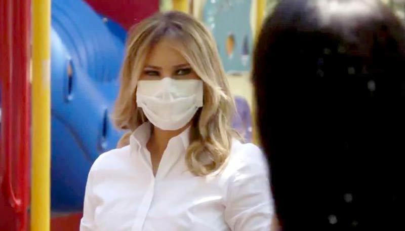 Đệ nhất phu nhân Mỹ Melania Trump, hôm 12/7, đưa lên mạng xã hội Twitter một video ghi cảnh bà đeo khẩu trang khi tới thăm Nhà Mary Elizabeth.