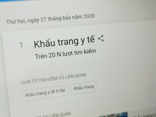 Sáng 27/7, "khẩu trang y tế" đứng top 1 những từ khóa được người dùng Internet tìm kiếm nhiều nhất trên Google tại Việt Nam. Với hơn 20.000 lượt tìm kiếm chỉ trong buổi sáng, khẩu trang y tế là mặt hàng nhận được sự quan tâm nhất của người dùng khi diễn biến dịch Covid-19 trong nước đang trở nên phức tạp.
