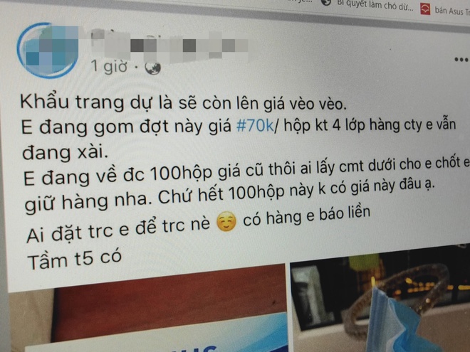 Trong đó, nhiều tài khoản chủ động gom khẩu trang thùng với giá 50.000-70.000 đồng/hộp 50 cái và bán lại với giá 80.000-100.000 đồng/hộp trên trang cá nhân.