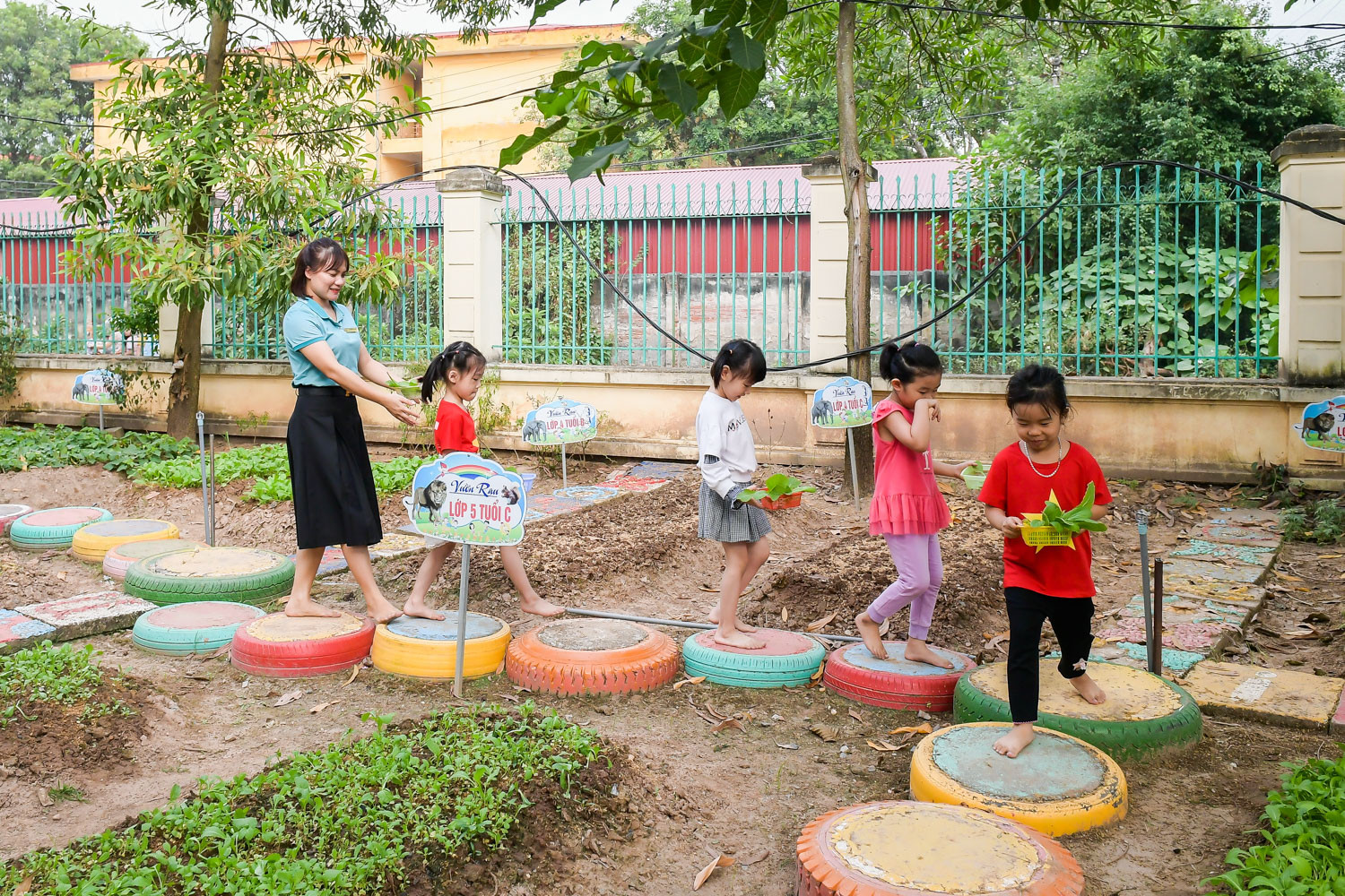 Chân trần cùng học sinh ra chăm vườn rau ở sân trường, trên gương mặt lấm tấm mồ hôi nhưng vẫn sáng lên nụ cười, Xen tâm sự, cô bén duyên với nghề mầm non chỉ vì tình yêu dành trẻ nhỏ. Thế nên, công việc dù vất vả cô vẫn thấy vui.