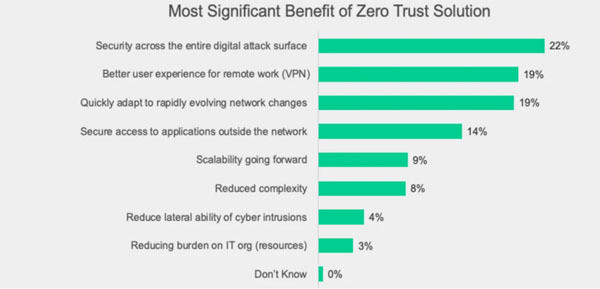 Bên cạnh đó, phản hồi của những người tham gia khảo sát còn cho thấy, “Bảo mật trên toàn bộ bề mặt tấn công kỹ thuật số” là lợi ích quan trọng nhất, tiếp theo là “trải nghiệm người dùng tốt hơn cho hoạt động làm việc từ xa (VPN)”.