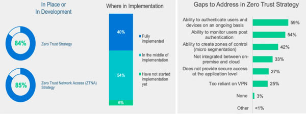 Tuy nhiên, hơn 80% người phản hồi chỉ ra rằng việc triển khai chiến lược bảo mật Zero Trust trên một hệ thống mạng mở rộng là một điều thực sự khó khăn. Đối với các tổ chức không có chiến lược cụ thể, các trở ngại còn nằm ở việc thiếu hụt nguồn lực có kỹ năng với 35% tổ chức sử dụng các chiến lược CNTT khác để triển khai mô hình bảo mật Zero Trust.