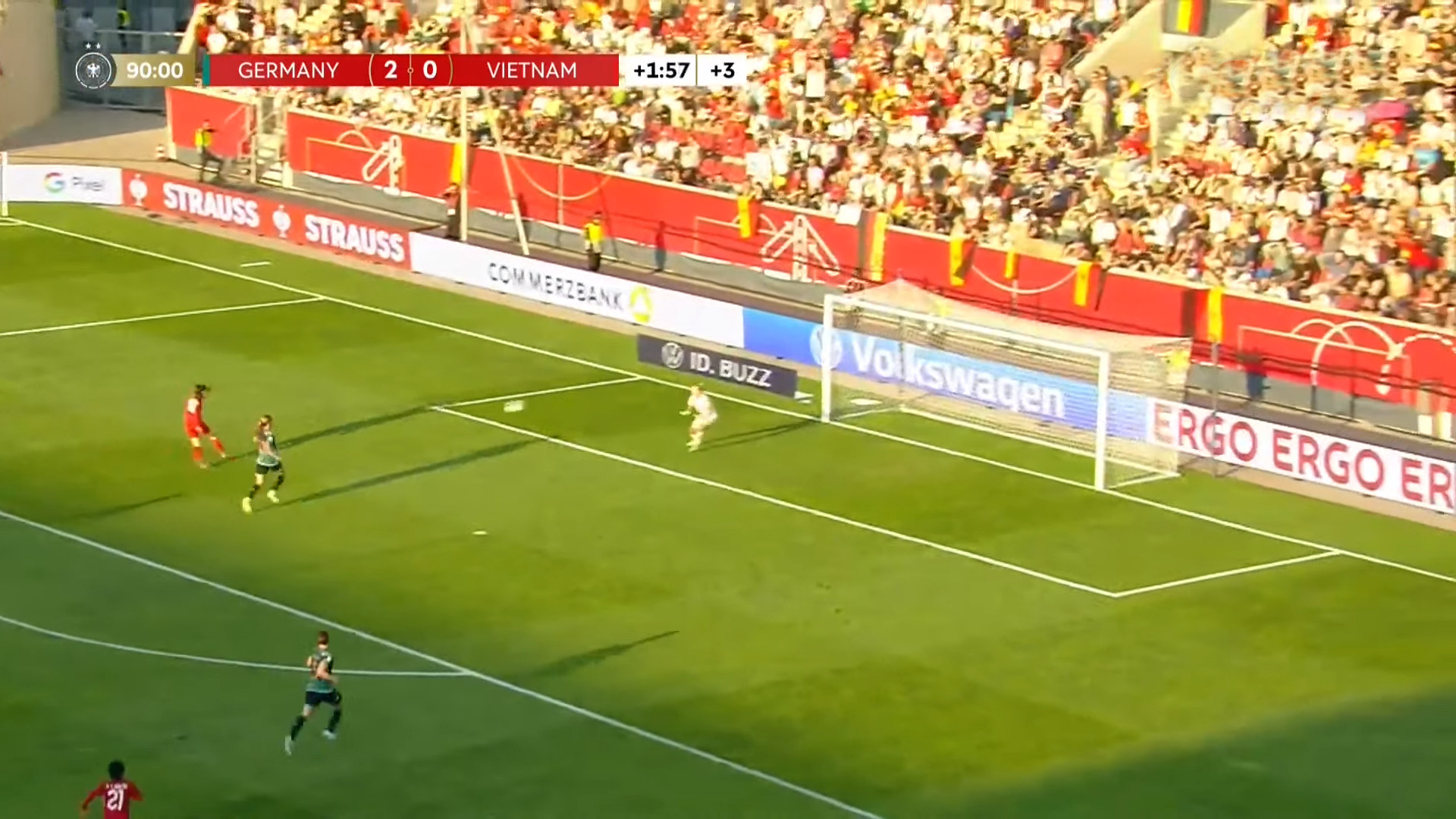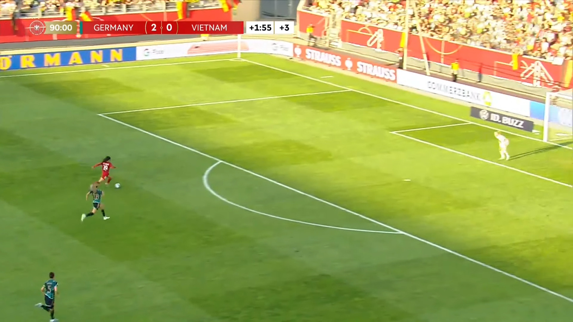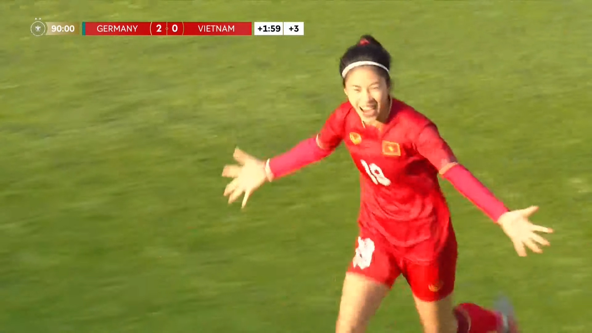 Tình huống diễn ra vào phút bù giờ thứ 2 trận giao hữu quốc tế giữa hai đội tuyển nữ Đức và Việt NamXuất phát từ pha chuyển trạng thái nhanh của đội khách, cầu thủ vào sân thay người Ngân Thị Vạn Sự chuyền bóng đầy thuận lợi lên phía trênNguyễn Thị Thanh Nhã, thi đấu từ đầu trận, thực hiện pha bứt tốc mạnh mẽ, bỏ lại sau lưng 3 hậu vệ ĐT Đức và băng lên như chiếc F1"Cơn lốc đường biên" của tuyển nữ Việt Nam dứt điểm về góc xa bằng chân trái, đánh bại thủ môn Merle Frohms Nên nhớ Merle Frohms là một trong những thủ môn xuất sắc nhất tại UEFA Champions League nữ mùa giải vừa quaNiềm vui vỡ òa của nữ cầu thủ sinh năm 2001Các đồng đội ăn mừng bàn thắng để đời của cô gái quê Thường Tín, Hà Nội vào lưới đội bóng số 2 thế giớiDù chỉ là một trận giao hữu nhưng đây có lẽ là một trong những khoảnh khắc đáng nhớ nhất trong sự nghiệp của Thanh Nhã, cũng như ĐT nữ Việt NamNiềm vui của ban huấn luyện và các cầu thủ dự bị ĐT Việt NamLan tỏa trên các khán đàiĐây là lần đầu tiên bóng đá nữ Việt Nam (hạng 32 FIFA) ghi bàn vào lưới một đội tuyển nằm trong top 5 thế giới (Đức hạng 2) nên đã mang đến sự phấn khích cho người hâm mộ nước nhàThanh Nhã và các đồng chơi đầy nỗ lực trước đối thủ có thể hình và thể lực vượt trội Trận thua 1-2 trước các cô gái Đức cho thấy thầy trò HLV Mai Đức Chung đã tiến bộ rất nhiều sau chuyến tập huấn tại châu ÂuKết quả này mang lại sự tự tin cho Thanh Nhã, Huỳnh Như và các đồng trước khi bước vào tranh tài tại VCK World Cup 2023 sắp tới