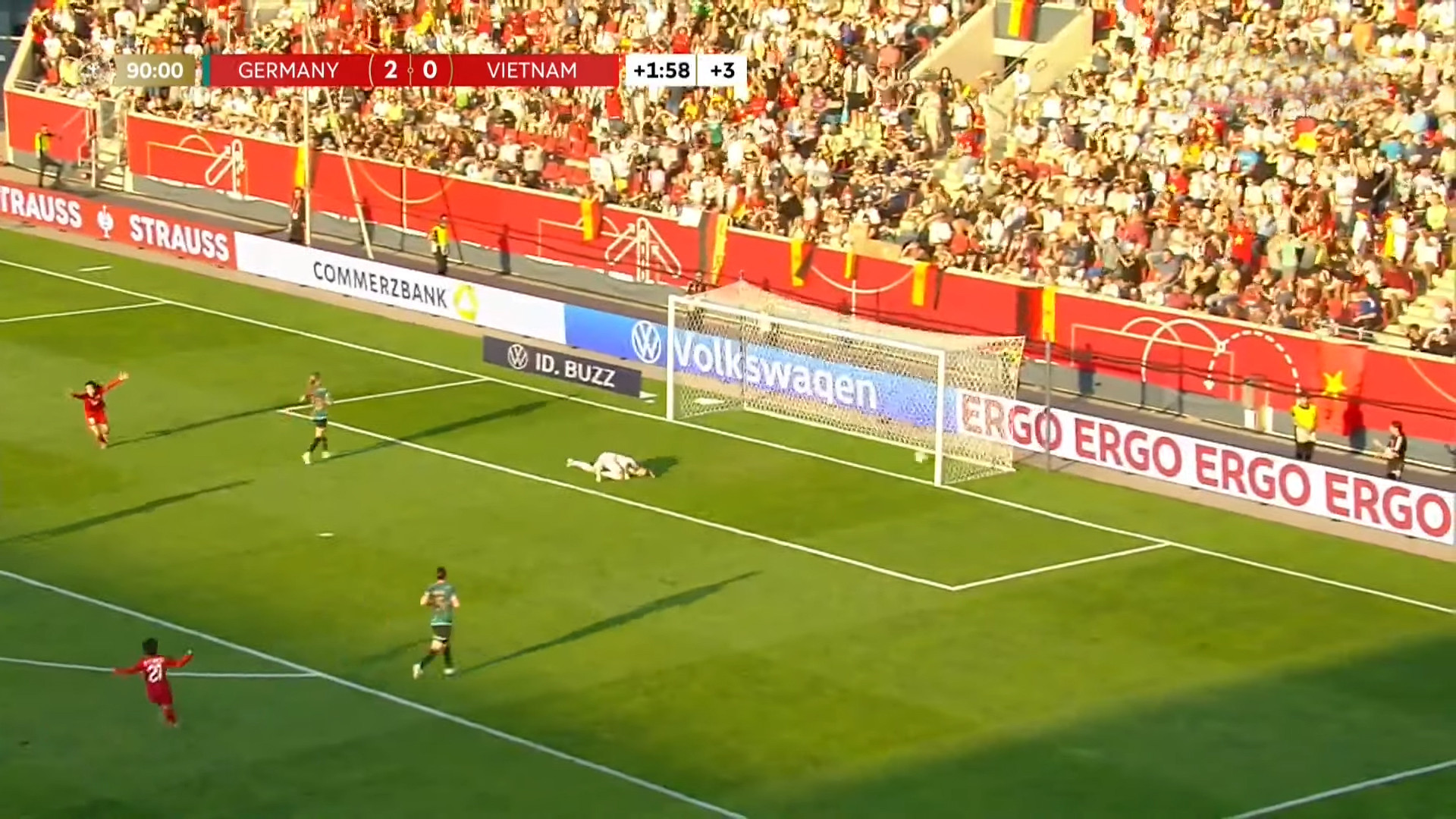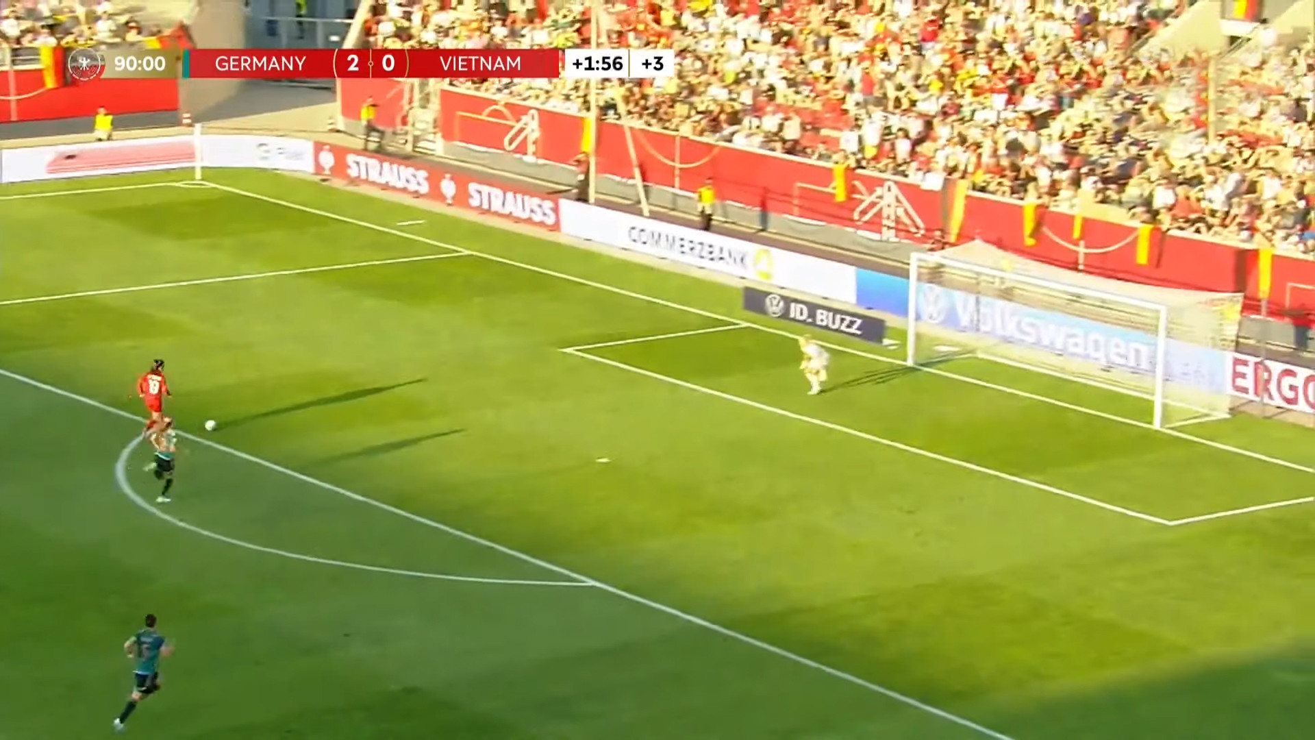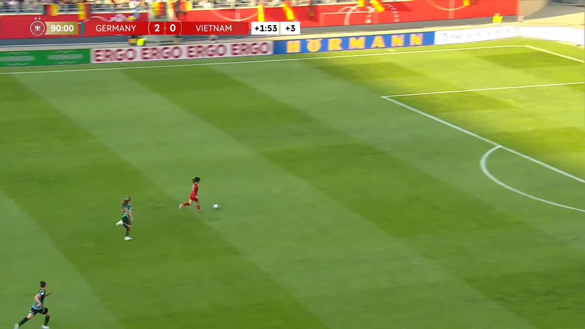Tình huống diễn ra vào phút bù giờ thứ 2 trận giao hữu quốc tế giữa hai đội tuyển nữ Đức và Việt NamXuất phát từ pha chuyển trạng thái nhanh của đội khách, cầu thủ vào sân thay người Ngân Thị Vạn Sự chuyền bóng đầy thuận lợi lên phía trênNguyễn Thị Thanh Nhã, thi đấu từ đầu trận, thực hiện pha bứt tốc mạnh mẽ, bỏ lại sau lưng 3 hậu vệ ĐT Đức và băng lên như chiếc F1"Cơn lốc đường biên" của tuyển nữ Việt Nam dứt điểm về góc xa bằng chân trái, đánh bại thủ môn Merle Frohms Nên nhớ Merle Frohms là một trong những thủ môn xuất sắc nhất tại UEFA Champions League nữ mùa giải vừa quaNiềm vui vỡ òa của nữ cầu thủ sinh năm 2001Các đồng đội ăn mừng bàn thắng để đời của cô gái quê Thường Tín, Hà Nội vào lưới đội bóng số 2 thế giớiDù chỉ là một trận giao hữu nhưng đây có lẽ là một trong những khoảnh khắc đáng nhớ nhất trong sự nghiệp của Thanh Nhã, cũng như ĐT nữ Việt NamNiềm vui của ban huấn luyện và các cầu thủ dự bị ĐT Việt NamLan tỏa trên các khán đàiĐây là lần đầu tiên bóng đá nữ Việt Nam (hạng 32 FIFA) ghi bàn vào lưới một đội tuyển nằm trong top 5 thế giới (Đức hạng 2) nên đã mang đến sự phấn khích cho người hâm mộ nước nhàThanh Nhã và các đồng chơi đầy nỗ lực trước đối thủ có thể hình và thể lực vượt trội Trận thua 1-2 trước các cô gái Đức cho thấy thầy trò HLV Mai Đức Chung đã tiến bộ rất nhiều sau chuyến tập huấn tại châu ÂuKết quả này mang lại sự tự tin cho Thanh Nhã, Huỳnh Như và các đồng trước khi bước vào tranh tài tại VCK World Cup 2023 sắp tới