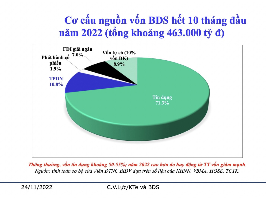 Theo báo cáo của Viện Đào tạo và Nghiên cứu BIDV, tính toán trong 10 tháng đầu năm 2022, cơ cấu nguồn vốn bất động sản có 71% là tín dụng ngân hàng, trong khi đó cổ phiếu chỉ chiếm khoảng 2%, vốn tự có khoảng 10%, trái phiếu doanh nghiệp 10%, vốn FDI 7%.