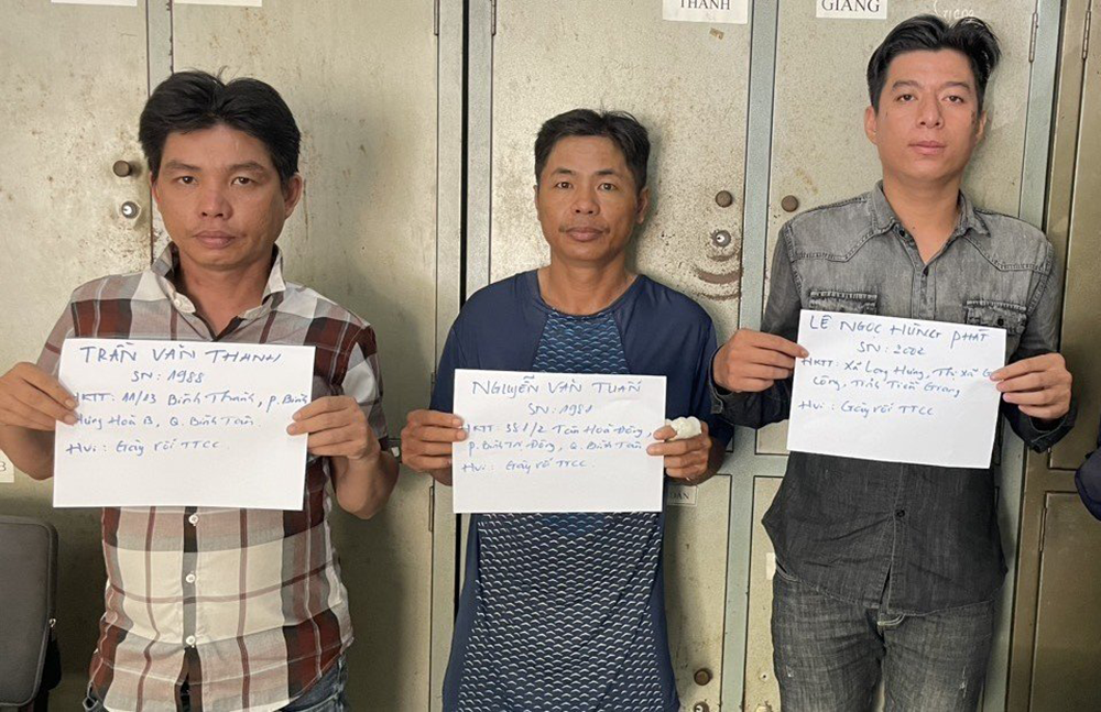 Công an quận 11, TP.HCM vừa tống đạt quyết định định tố vụ án, khởi tố bị can, bắt tạm giam 3 đối tượng gồm: Lê Ngọc Hùng Phát (21 tuổi, quê Tiền Giang), Trần Văn Thanh (35 tuổi), Nguyễn Văn Tuấn (42 tuổi, cùng ngụ quận Bình Tân) về tội “Gây rối trật tự công cộng”.