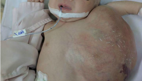 Khi vừa sinh ra, bé gái có khối bướu dị dạng mạch máu kéo dài từ vùng cổ, vai và phình ra toàn bộ thành ngực hông trái.