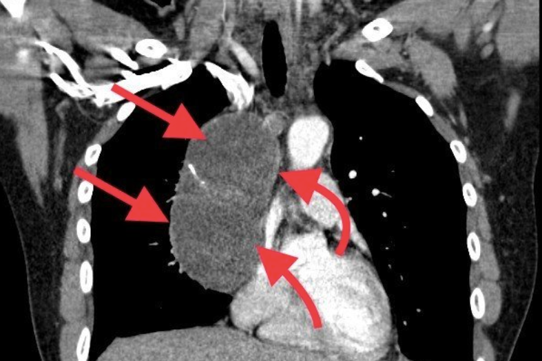 Bệnh nhân tên M.T.S, ở Định Hóa, Thái Nguyên, nhập viện trung tuần tháng 4. Kết quả hội chẩn liên khoa, bác sĩ đưa ra kết luận chẩn đoán u trung thất. Khối u trong lồng ngực lớn, đã có biến chứng chèn ép vào tim, phổi và mạch máu, có nguy cơ ảnh hưởng đến tính mạng người bệnh.