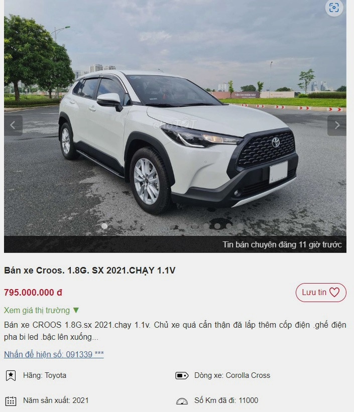 Một chiếc Corolla Cross bản 1.8 G AT đã lăn bánh 11.000 km đang được rao bán với giá 795 triệu đồng, chênh cao hơn 49 triệu đồng so với giá xe mới.
