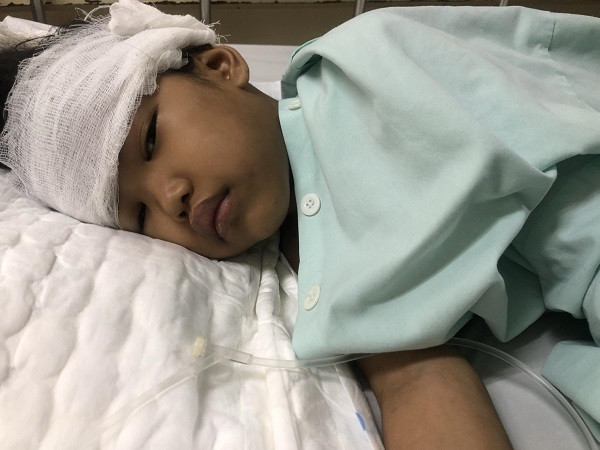"Lúc phát hiện con có tật, vợ chồng tôi cũng đưa cháu đến khắp các bệnh viện tuyến Trung ương mong chữa khỏi. Cháu được các bác sĩ mổ phẫu thuật não để làm ống dẫn lưu xông dưới bụng", chị Quyên nhớ lại.