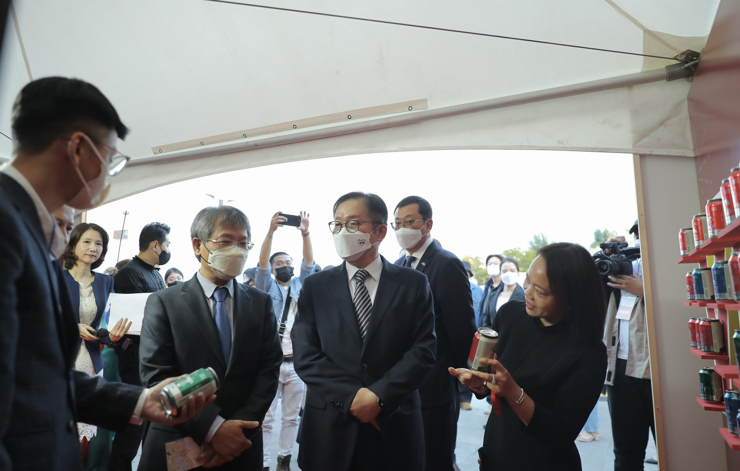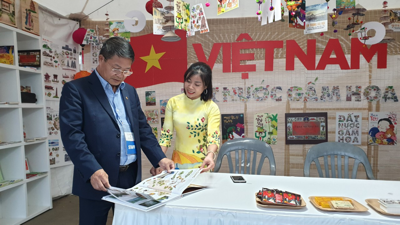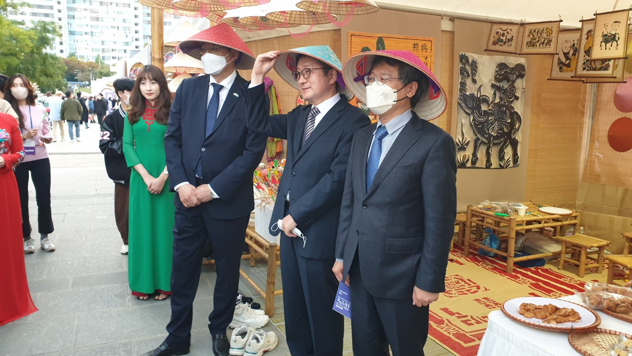 Chiều 14/10, theo giờ địa phương, trong khuôn khổ Lễ hội kết nối Văn hóa, tại Quảng trường sự kiện công viên sông Hàn Yeoido, Thủ đô Seoul (Hàn Quốc), Bộ VHTTDL Việt Nam đã tổ chức khai mạc không gian văn hóa Việt Nam. Đây là sự kiện đầu tiên mở màn cho chuỗi sự kiện thuộc Lễ hội Du lịch- Văn hóa Việt Nam tại Hàn Quốc.Tại sự kiện, không gian trưng bày hơn 200 cuốn sách giới thiệu văn hoá của Việt Nam đã được giới thiệu với công chúng. (Ảnh: Phó Cục trưởng Cục Xuất bản, In và Phát hành Phạm Tuấn Vũ tại không gian trưng bày).Ông Trần Nhất Hoàng - Phó Cục trưởng Cục hợp tác quốc tế (Bộ VHTTDL) giới thiệu cuốn sách Lược sử nước Việt bằng tranh của NXB Kim Đồng được in bằng hai thứ tiếng Việt - Hàn.Không gian trưng bày này có khoảng hơn 200 cuốn sách. Trong đó, nhiều cuốn sách bằng tiếng Việt và nhiều cuốn sách được Hàn Quốc mua bản quyền in bằng tiếng Hàn để giới thiệu với bạn đọc. Ông Trần Nhất Hoàng cho hay, đây là không gian trưng bày sách hiếm hoi ở các lễ hội. "Ở Hàn Quốc, văn hoá đọc được đề cao. Trong khi đó, ở Việt Nam, xuất bản phẩm được mua bản quyền như là một ngành công nghiệp văn hoá thường rất hiếm. Việc chúng tôi kết hợp với Cục Xuất bản, In và Phát hành, NXB Kim Đồng mang những cuốn sách đã được Hàn Quốc mua bản quyền trưng bày tại đây là một nỗ lực rất lớn quảng bá công nghiệp văn hoá của Việt Nam ra nước ngoài", ông Trần Nhất Hoàng chia sẻ.Đại sứ Việt Nam tại Hàn Quốc Nguyễn Vũ Tùng và Chủ tịch Quỹ Giao lưu Văn hóa Quốc tế Hàn Quốc Jung Kil-hwa đội nón lá Việt Nam.Chữ Việt Nam được xếp từ 63 lon bia tượng trưng cho 63 tỉnh thành của dài đất hình chữ S. Mỗi lon bia in hình tên riêng của các tỉnh thành và dấu ấn đặc trưng vùng miền của tỉnh thành đó.Các đại biểu rất thích thú với sự sáng tạo này của Việt Nam.Du khách trải nghiệm ẩm thực Việt Nam. Việc trải nghiệm vẽ trên nón lá khiến du khách vô cùng hào hứng.