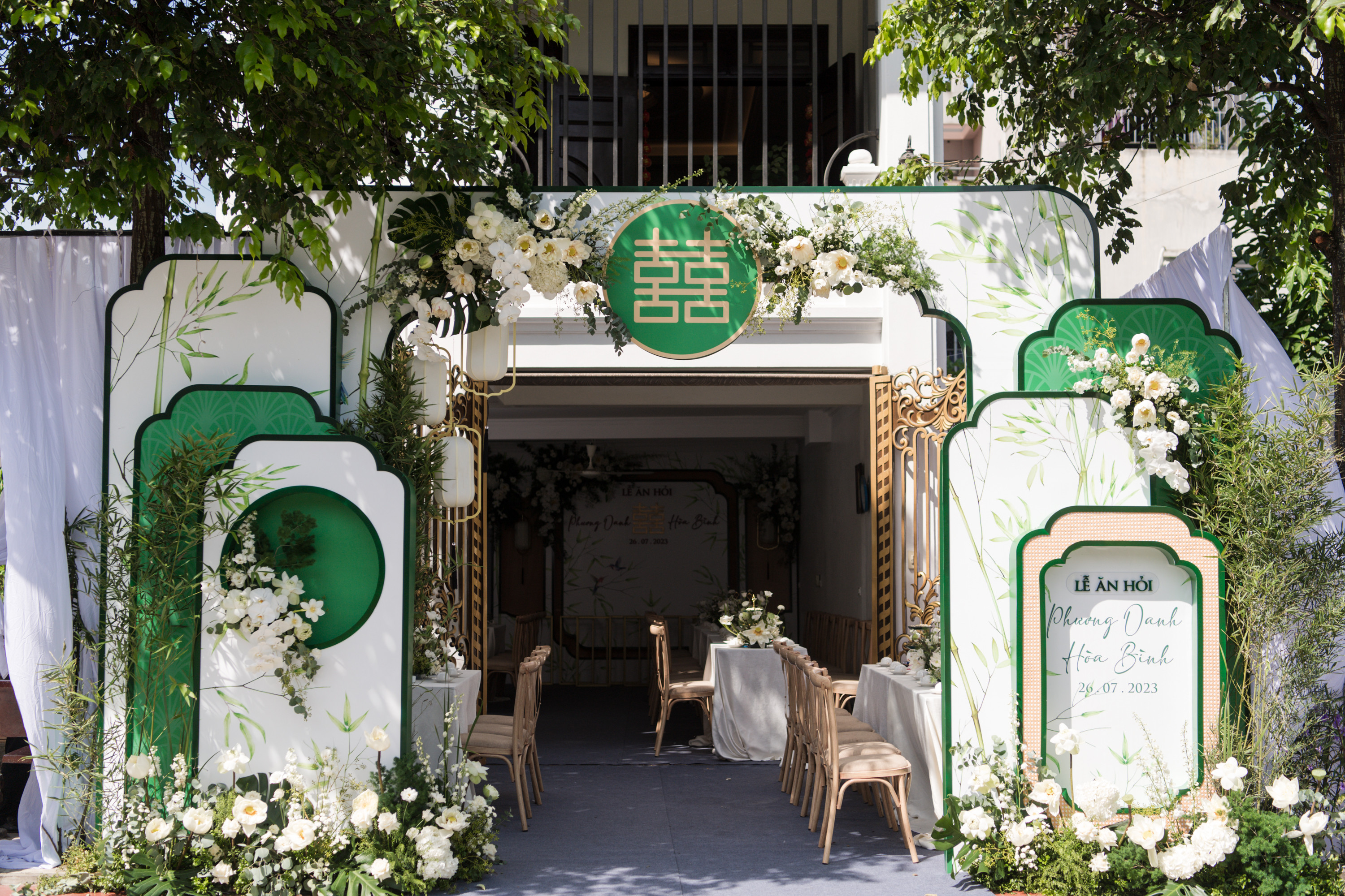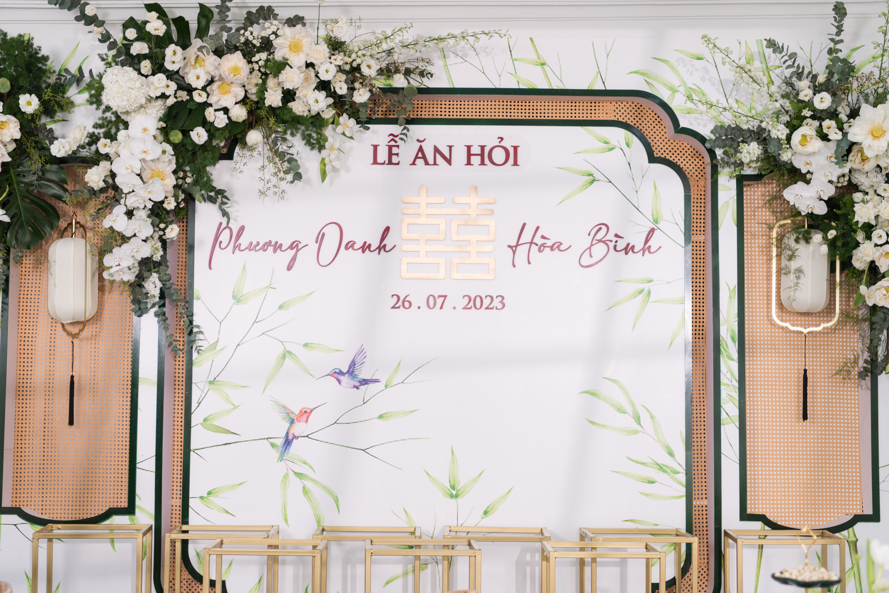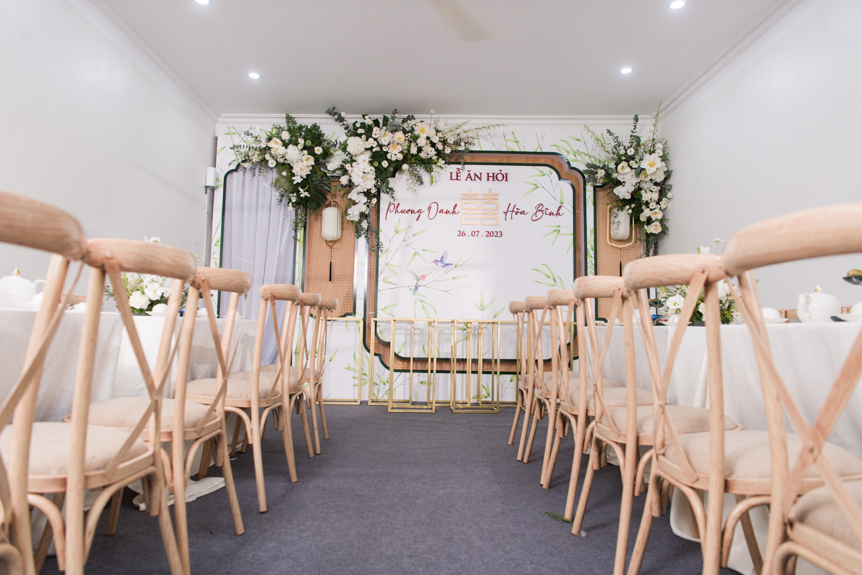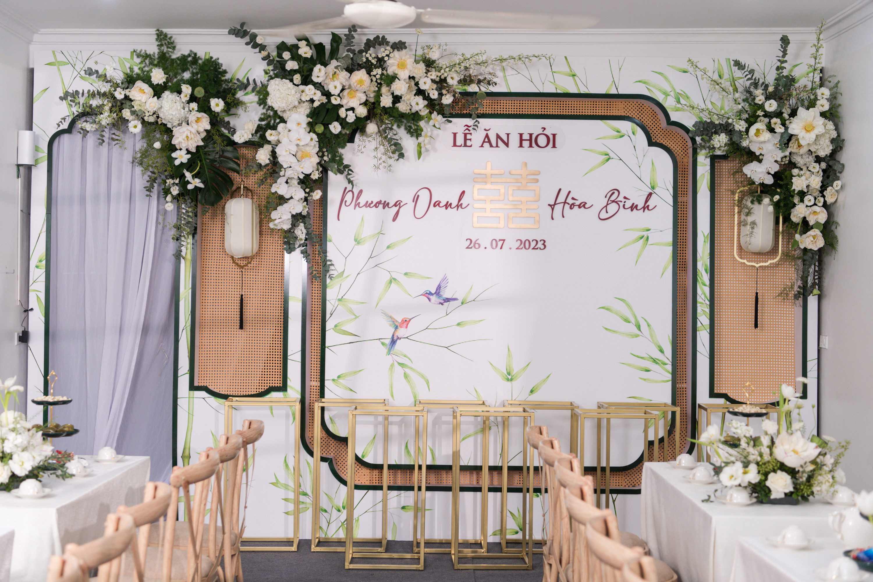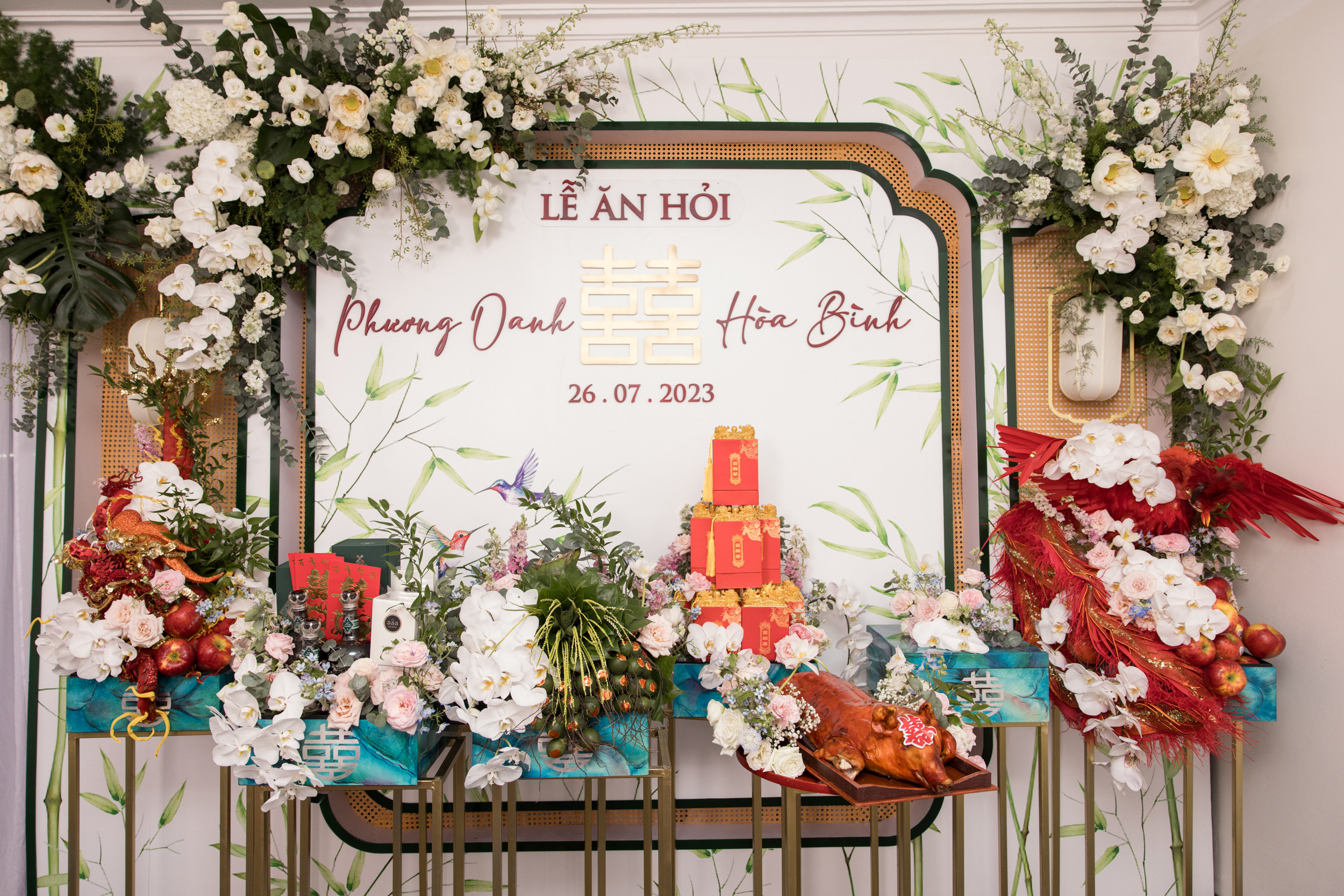 Trước đó, Phương Oanh đã tới thử áo dài cho ngày trọng đại do Hoa hậu Ngọc Hân thiết kế vào cuối tuần qua. Hơn một tháng sau khi đăng ký kết hôn với Shark Bình, lễ ăn hỏi của nữ diễn viên 'Hương vị tình thân' được tổ chức tại nhà riêng của Phương Oanh tại Hà Nam. Không gian buổi lễ được trang trí với tông màu trắng - xanh mang cảm giác dịu mát ngày hè. 600 bông hoa sen cùng trúc và rất nhiều loại hoa nhập khẩu khác như: tulip, hồng, Lan Hồ Điệp… được dùng để tô điểm cho không gian nhà nữ diễn viên.Quá trình trang trí diễn ra hai ngày trước khi buổi lễ diễn ra. Phương Oanh là người đưa ra ý tưởng trang trí lễ ăn hỏi bằng trúc và sen. Hoa sen trở thành chủ đề chính cho lễ gia tiên của Phương Oanh và chồng sắp cưới hơn 8 tuổi. Lễ ăn hỏi của Phương Oanh và Shark Bình diễn ra trưa 26/7 nhưng từ sáng sớm, một số bạn bè thân thiết đã có mặt ở Phủ Lý để giúp cô sửa soạn cho ngày trọng đại. Hoa hậu Ngọc Hân không chỉ giúp Phương Oanh lo chuyện trang phục mà còn cùng ê-kíp trang trí cắm hoa để bàn phong cách ikebana tô điểm cho bữa tiệc. Phương Oanh xác nhận tổ chức lễ ăn hỏi cùng Shark Bình cách đây gần 1 tuần. Nữ diễn viên cho biết cô mong muốn ngày trọng đại diễn ra riêng tư, ấm cúng ở quê nhà. Phương Oanh hạnh phúc khi chuyện tình cảm của mình được gia đình hai bên vun vén, ủng hộ.Sính lễ của nhà traiNói về định hướng sau khi kết hôn, Phương Oanh cho biết cô đặt gia đình lên ưu tiên hàng đầu nhưng không có ý định làm nội trợ toàn thời gian mà sẽ duy trì sự nghiệp riêng.Phương Oanh và Shark Bình hoàn thành thủ tục kết hôn từ 15/6 tại Phủ Lý (Hà Nam), quê nữ diễn viên. Trước khi quyết định trở thành vợ chồng, họ có 1 năm hẹn hò. Phương Oanh sinh năm 1989, khởi nghiệp làm mẫu trước khi lấn sân đóng phim. Cô nổi tiếng với các phim: Quỳnh búp bê, Ngược chiều nước mắt, Lặng yên dưới vực sâu, Hương vị tình thân....