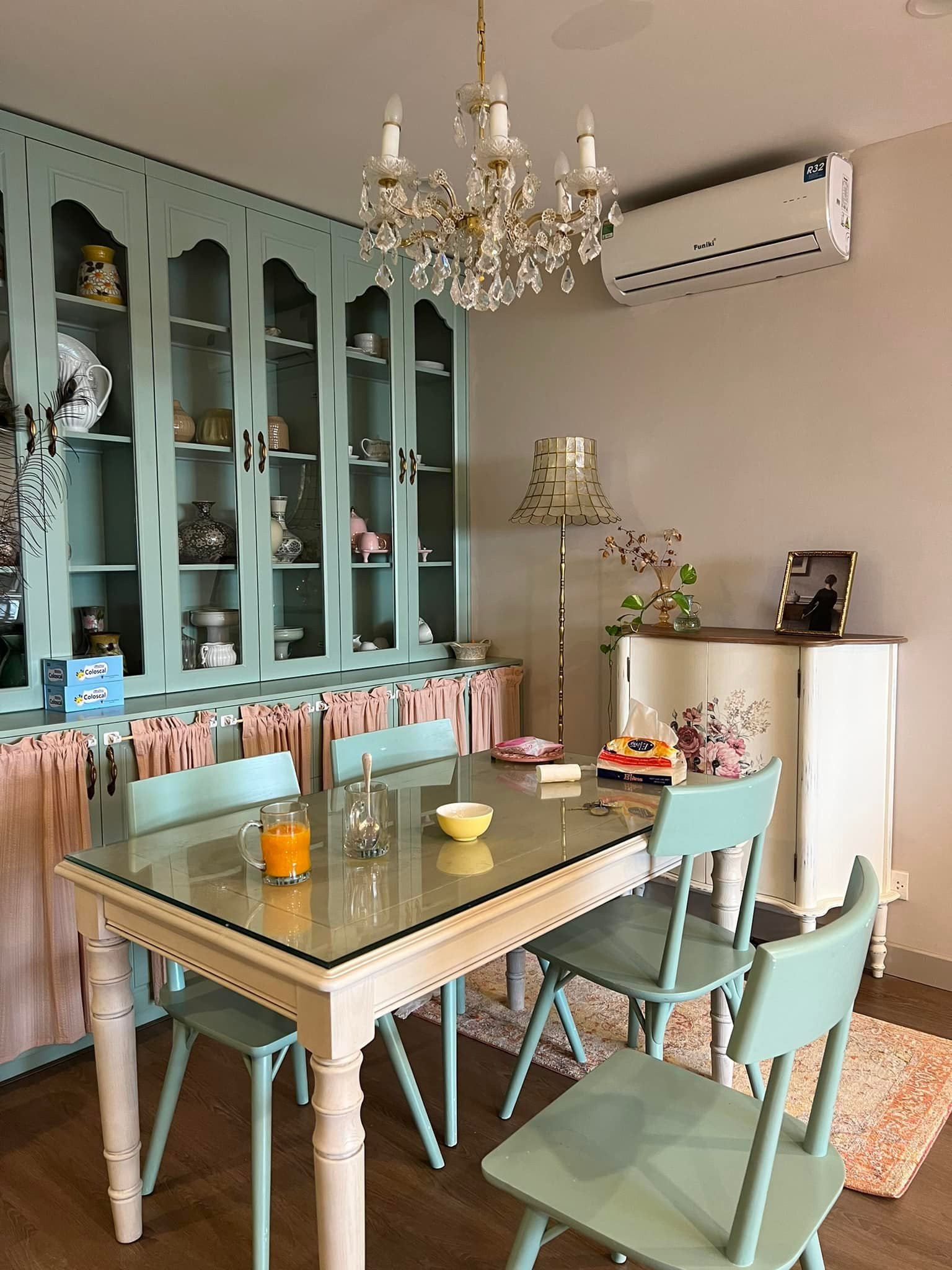 Ghế bàn ăn và tủ trang trí nguyên bản màu xanh mint mát mẻ nhưng Phương Anh đã thuyết phục gia chủ đổi tone màu, thêm chiếc đệm ghế, đặt bình hoa khô là biến thành góc rất "Tây".