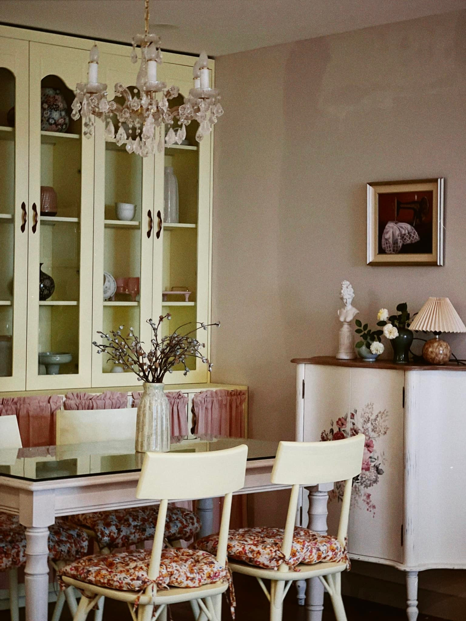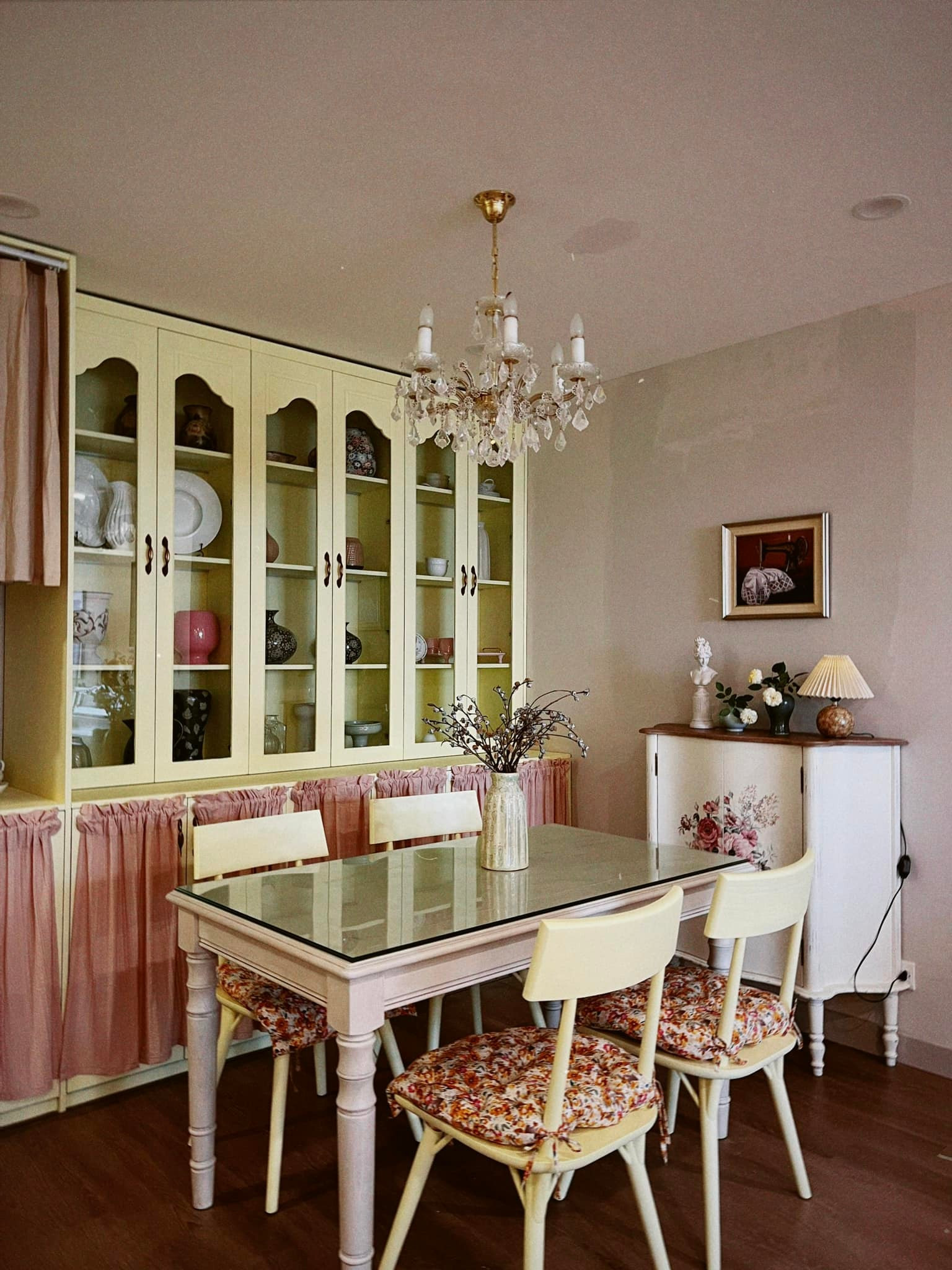 Góc bàn ăn vintage với gam hồng và vàng chanh nhạt.