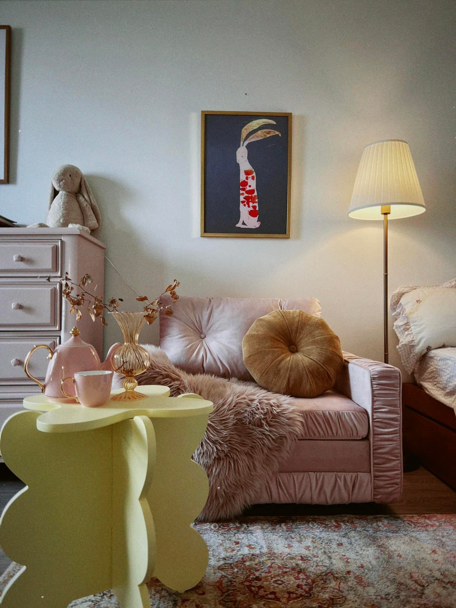 Ngoài chiếc tủ hồng, phòng được đặt thêm chiếc sofa êm ái và chiếc bàn trà màu vàng thiết kế lạ mắt.