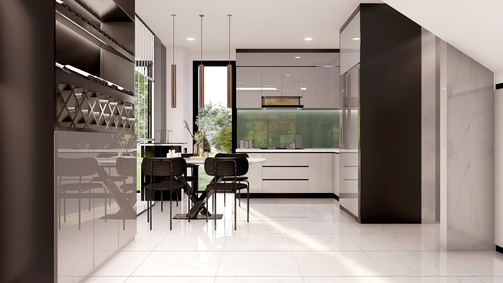 Bếp bố trí nhiều hộc, tủ để tăng diện tích lưu trữ cho gọn gàng. Đặc biệt phần gầm cầu thang là tủ kho mini tiện dụng, rộng rãi. Tủ rượu với chất liệu gỗ, kính tối màu tăng thêm sự sang trọng cho nhà.