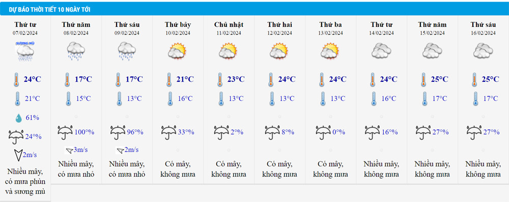 Riêng thời tiết khu vực Hà Nội, theo bảng trên, ngày 7/2, nhiệt độ vẫn ở mức cao nhất 24 độ, thấp nhất 21 độ. Khi không khí lạnh tràn về, mức nhiệt khu vực này giảm mạnh, cao nhất còn 17 độ, thấp nhất 15 độ. Ngày 9/2, nền nhiệt tiếp tục duy trì. Nhưng từ 10/2 (tức mùng 1 Tết), trời hửng nắng và tăng nhiệt trở lại.
